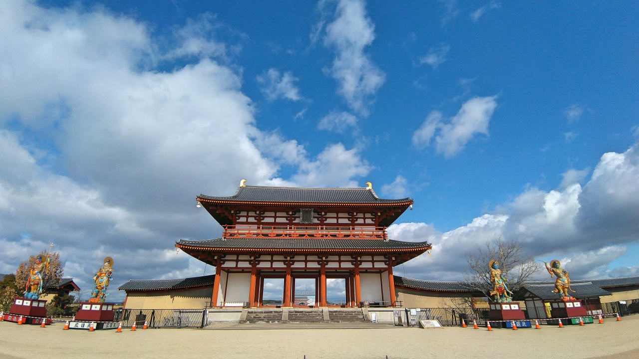 薬師寺と唐招提寺の拝観を終え、まだ少し時間があったので、「平城京跡」に寄ることにしました。バスを降りて、徒歩10分ほど、遠目でも目立つのは「遣唐使船」。大きな船が見えてきます。そして、ひときわ目を引くのは、復元された「朱雀門」です。ほか、レストラン・お土産屋さんを併設した建物もあるので、一休みできます。