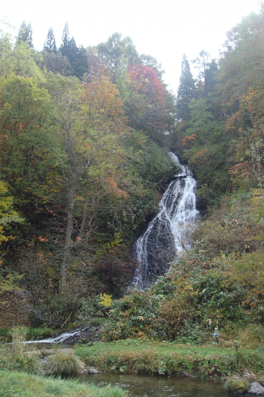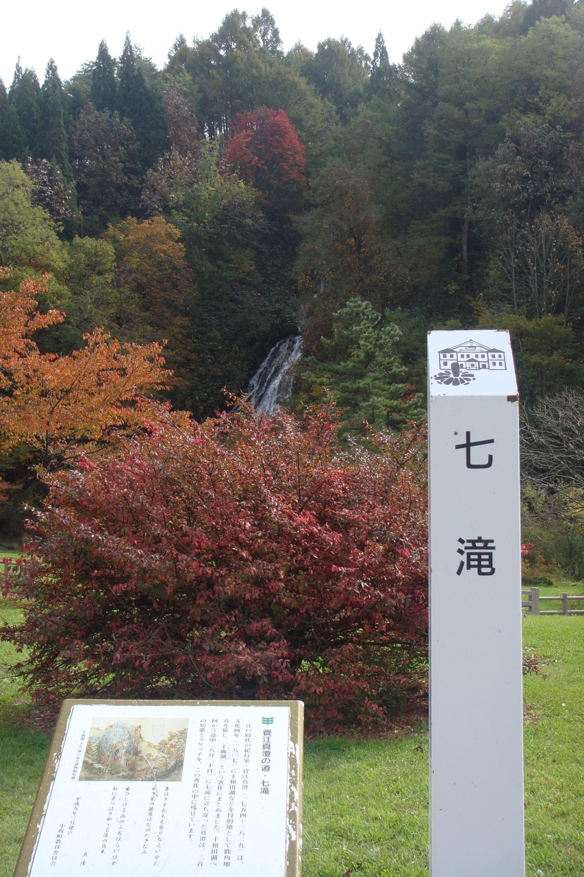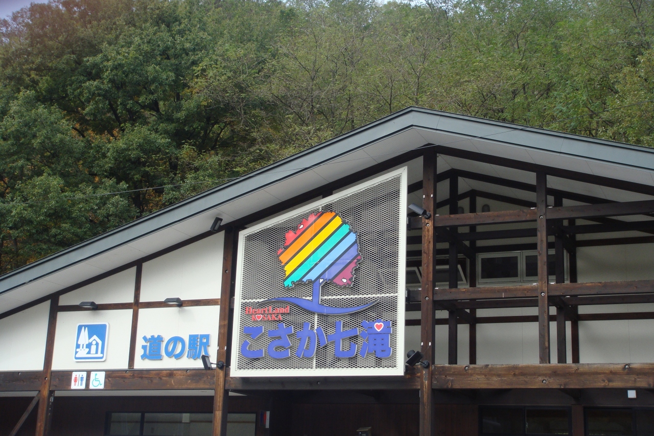 秋田県の大潟から十和田湖へ向かう途中、この道の駅でトイレ休憩。ハチミツ・みかんやブドウなどの産直コーナーの傍らに、フクロウの置物が。もっと近づいて行くと。何と!置物ではなく本物のフクロウだ。若い女性が生活雑貨などを露店で売りながら、このフクロウを連れているのだとか。道路を挟んで向かい側には七滝の看板がある。徒歩で1分くらいで見ごたえがある七滝が見えてくる。水量もまずまず。小橋からの滝の眺めが素晴らしい。滝の前には広場があり、ベンチや椅子に座って心ゆくまで紅葉と滝を見学できるのがいい。