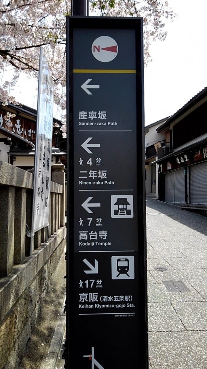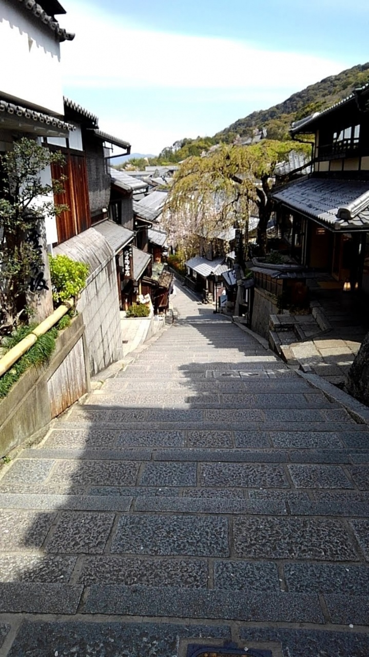 京都東山の散策と言ったら、『三年坂』『二年坂』は欠かせない存在です。『三年坂』は『産寧坂』とも書かれます。こちらは、坂の上の清水寺にある子安観音へ「お産が寧かでありますように」と祈願するために登る坂であることから『産寧坂』と表されるようになったということです。坂で転ぶと良くないようなのでゆっくりと歩きました。通常は坂も人波で埋め尽くされますが、今年のは花見シーズンだけは特別な感じがしました。誰もいない『産寧坂』は夜中でもない限り見ることはできないと思いました。