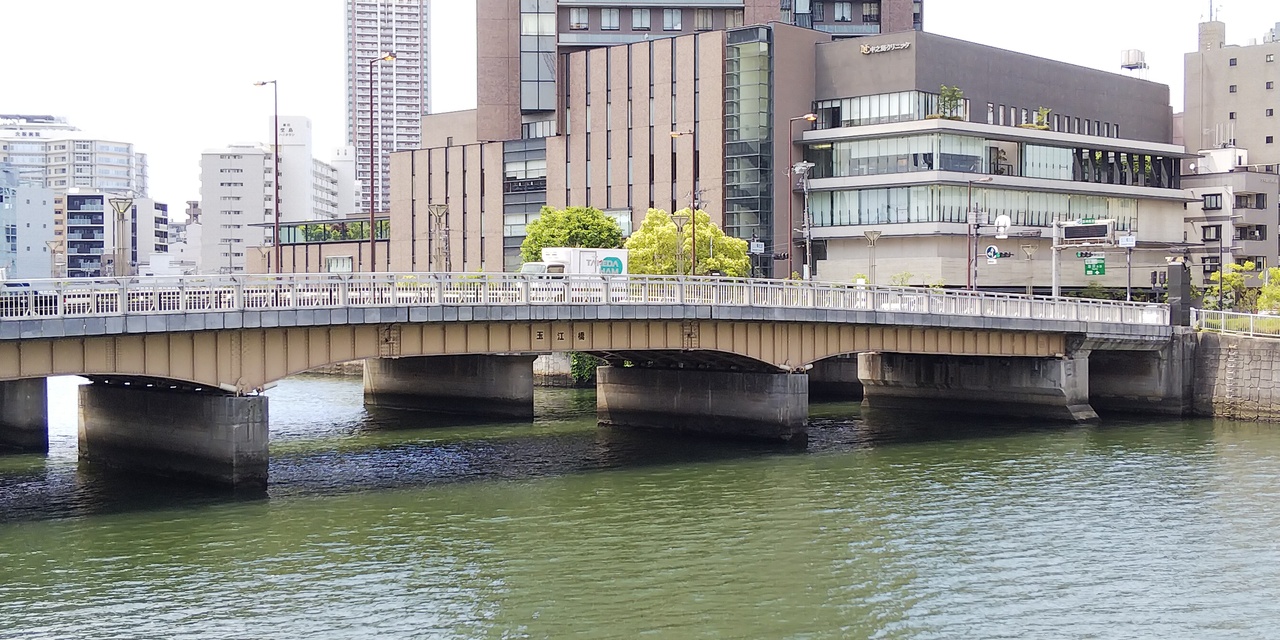 玉江橋は大阪梅田のちょっと南側、堂島川にかかっている橋です。中之島の北側にかかっていて、玉江橋北詰交差点を結んでいます。車道と歩道が別れている立派な橋です。江戸時代にかけられたのが最初で、明治時代には2度の消失でかけかえられています。
