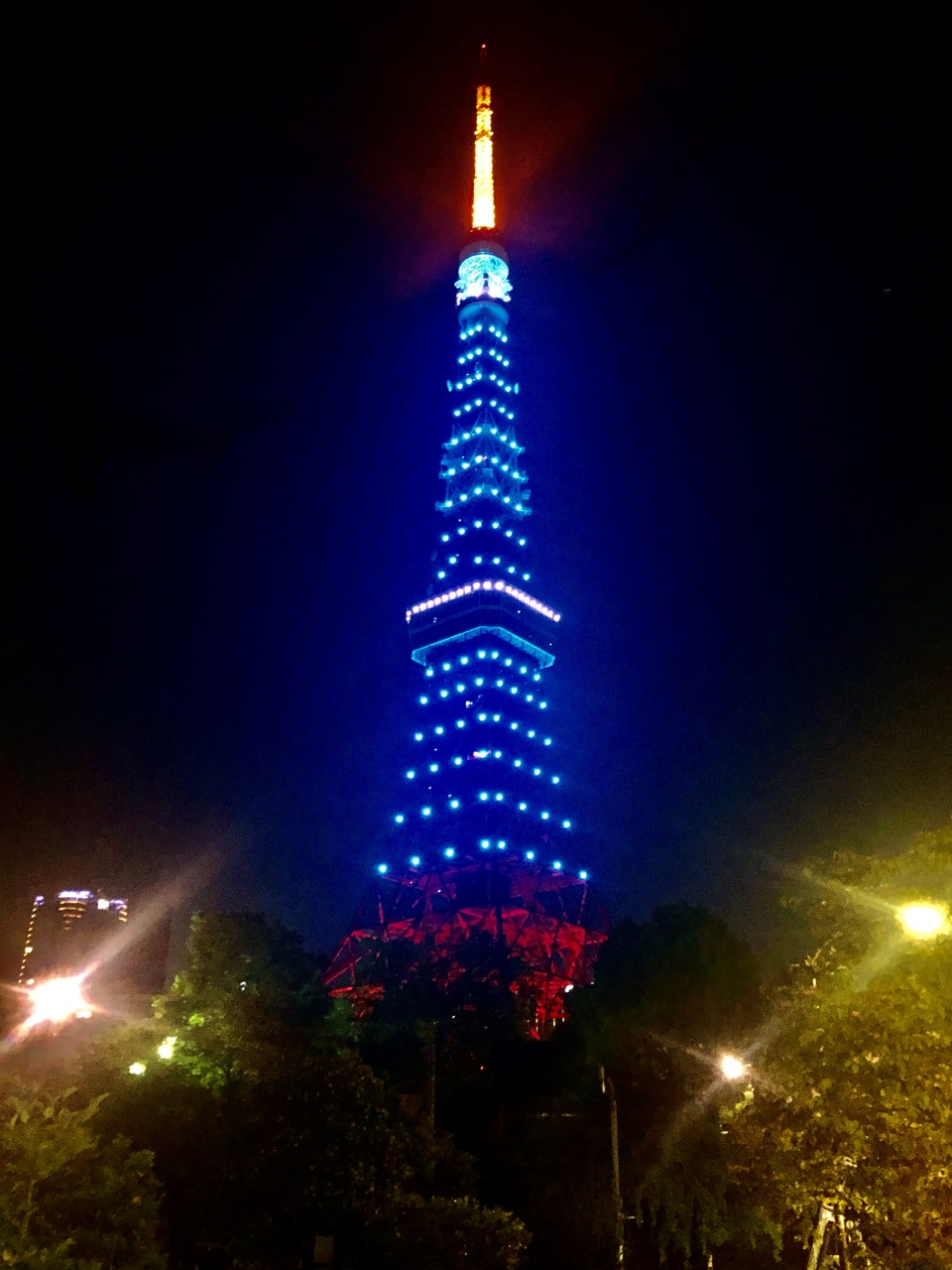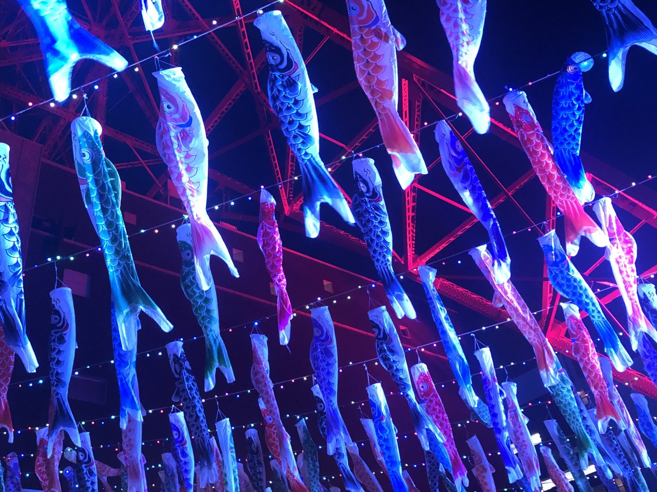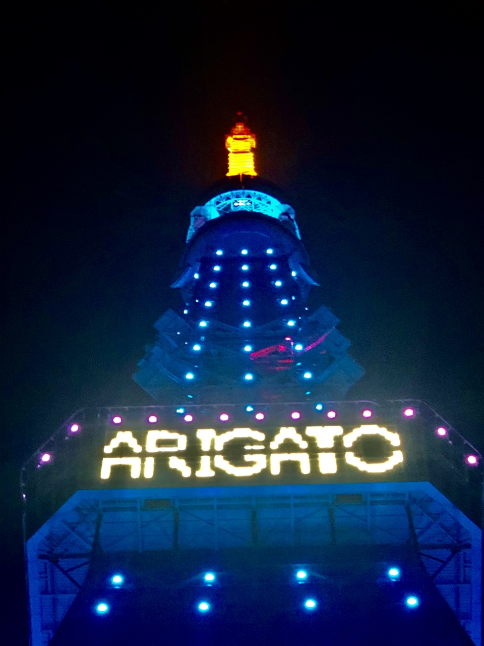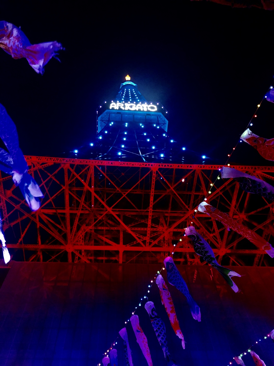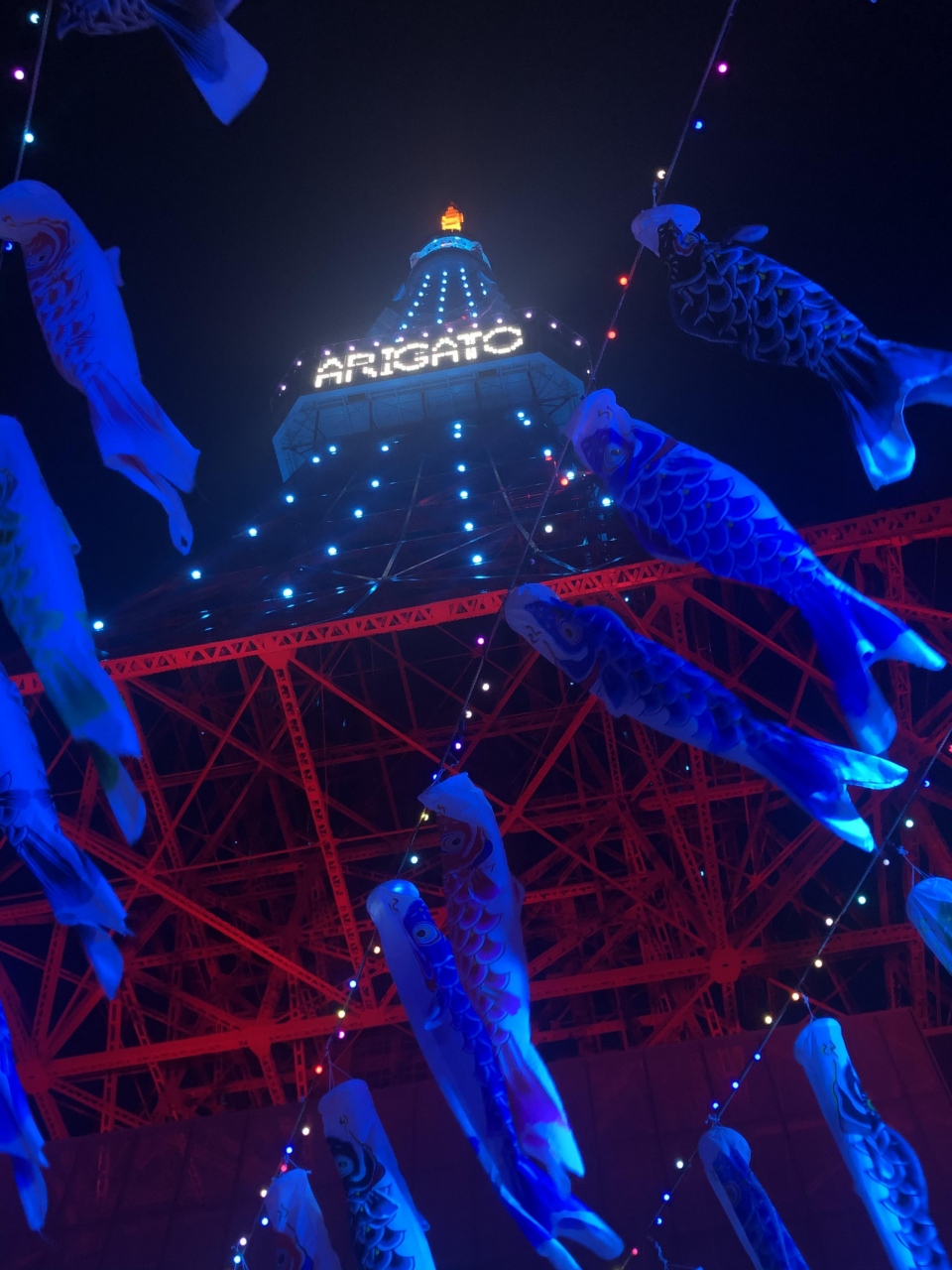 東京タワーと言えば高さ333mの電波塔、高さでは東京スカイツリーの634mに首位を譲ったが、今でも東京のシンボルである。現在コロナウィルスと戦う医療関係者に対する感謝を込めてブルーにライトアップされ、高さ150メートルに位置する大展望台にARIGATOと表示されている。季節柄たくさんの鯉のぼりが掛けられていた。
