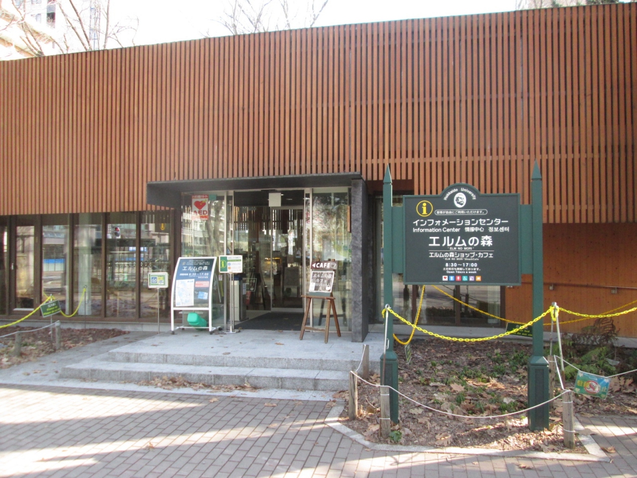 北大正門から入るとすぐ左にあり、内外とも木材を多く使用したおしゃれな施設です。