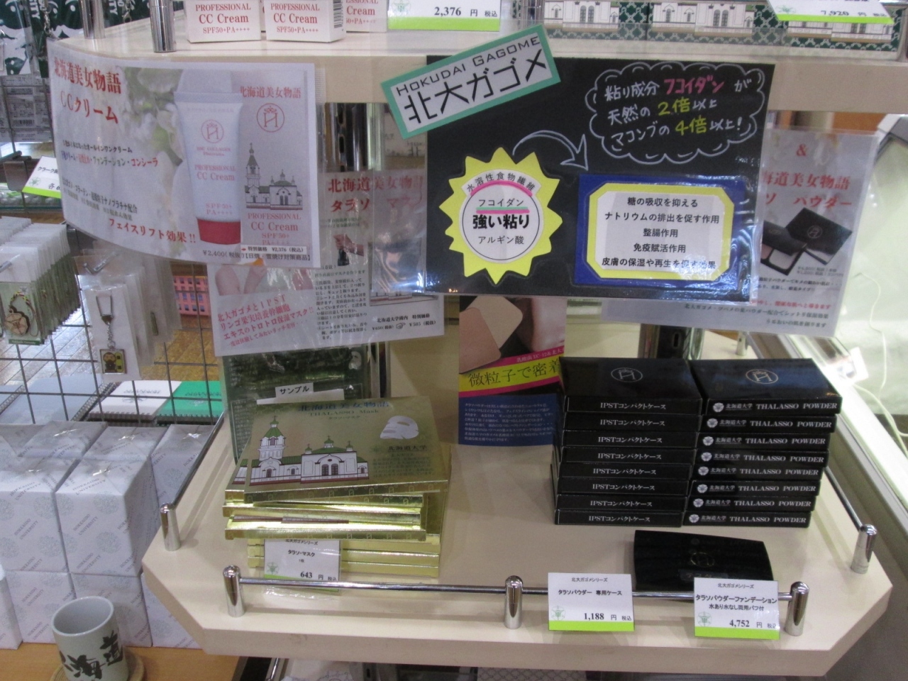 北大グッズは生協やコンビニなどでも扱っていますがここが一番品揃えが豊富ですし、「ポプラ並木」という名の大吟醸酒と「北海道美女物語」と名付けた化粧品は他では見当たらず、このショップ限定ではないでしょうか。