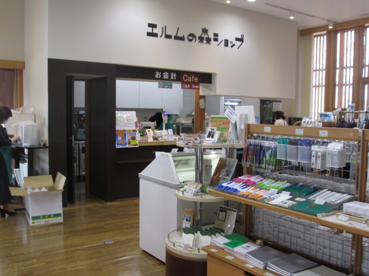 建物に入ると、右にパンフやインフォメーションカウンター、左は「エルムの森ショップ」、奥はカフェとなっています。