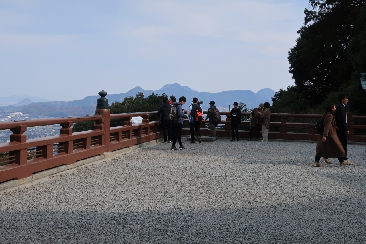階段を上がり切った本殿前。少し突き出た広場が展望台になっている。ここまで来たごほうびのような光景だ。讃岐平野にポツンポツンと小山が見えるが、古代は平野が海で、小山が島だったのではないか。広場の一角には灯台のような施設があった。海からこんぴらさんを拝むときの目印の灯りだったという。瀬戸内海からも見渡しがいいのだ。