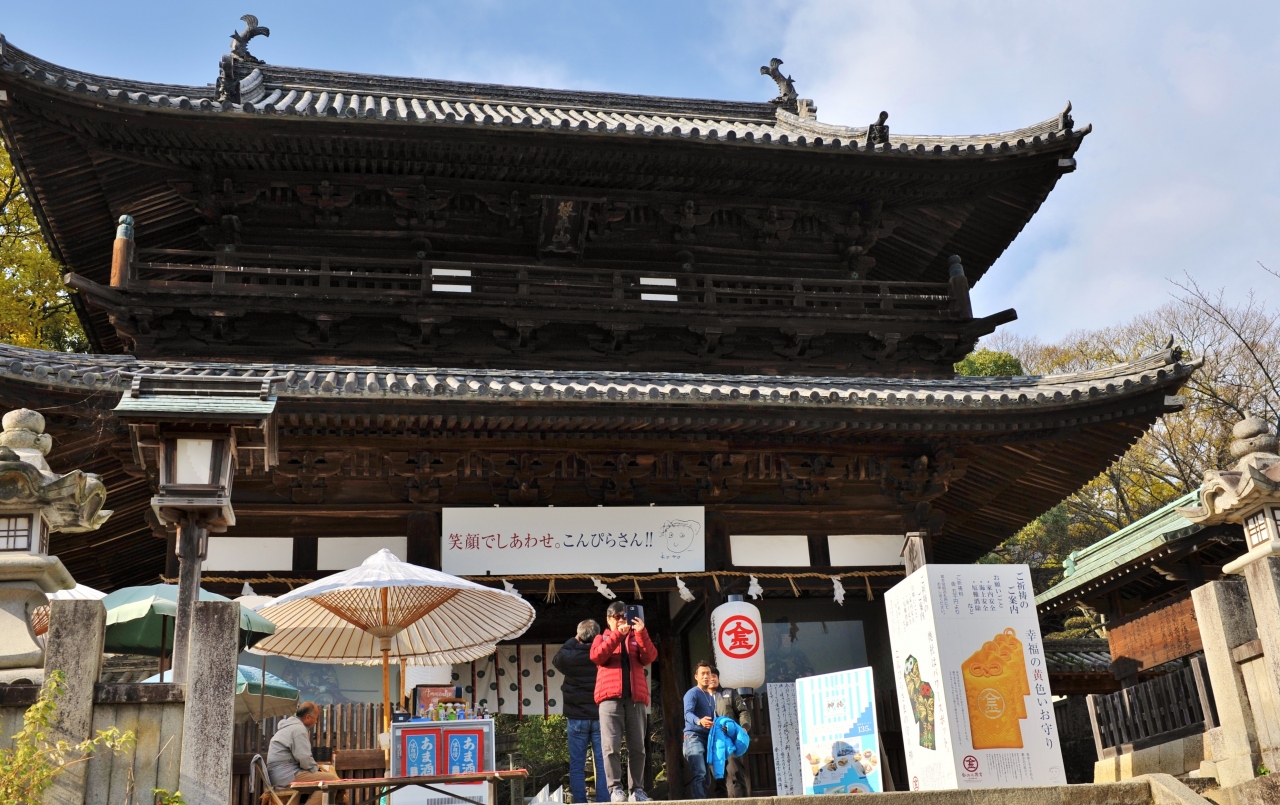 785段の階段のちょうど半分ぐらいにあるのが、この大門だ。ここから神社の境内、ご神域に入るという。大ぶりな二重門で、神門というよりも寺院風だ。水戸光圀の兄で、高松藩の藩主だったある松平頼重が寄進した。ここをくぐると五人百姓と呼ばれる飴屋さんが傘を連ねている。