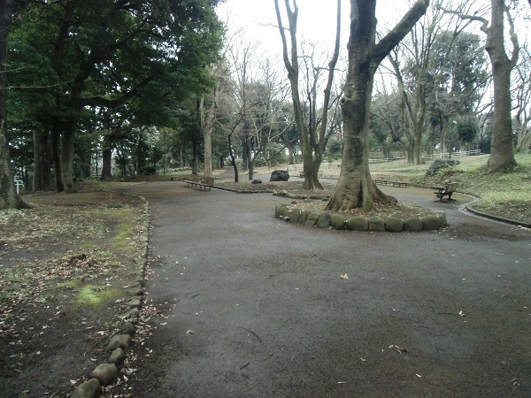 往時の庭園の一部が無料で公開されていますが、芝生広場の先に石灯籠や飛び石などの遺構がわずかに見られます。