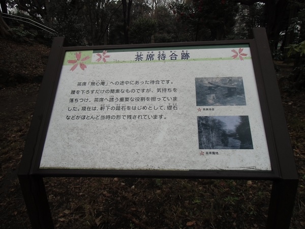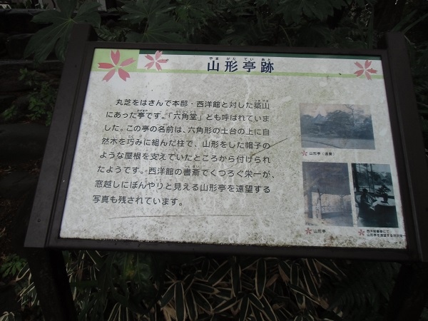 また、元あった建物の説明板(茶席待合、無心庵、山形亭、兜稲荷社など)が点在していますが、ほとんどが礎石を残すのみです。
