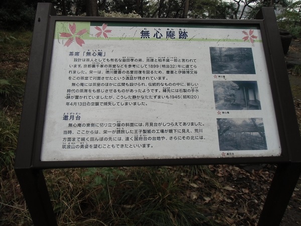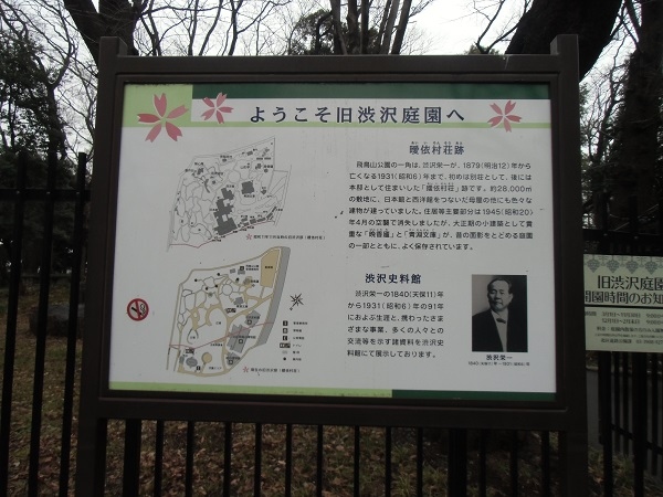 説明板によると、飛鳥山公園の一角は、渋沢栄一(1840~1931)が明治12年(1879)から亡くなる昭和6年(1931)まで、初めは別荘として、後に本邸として過ごした「曖依村荘」とよばれる邸宅跡です。