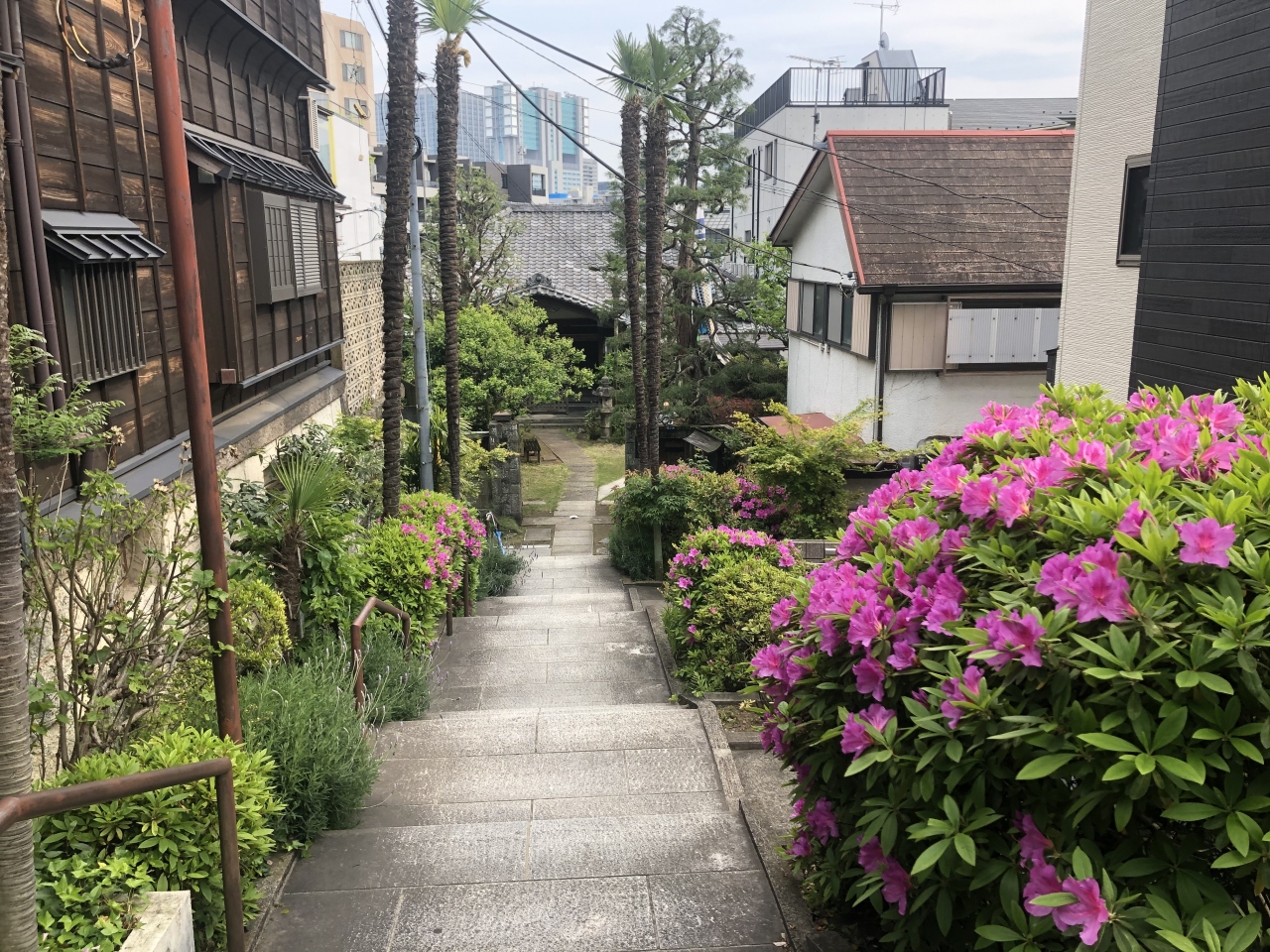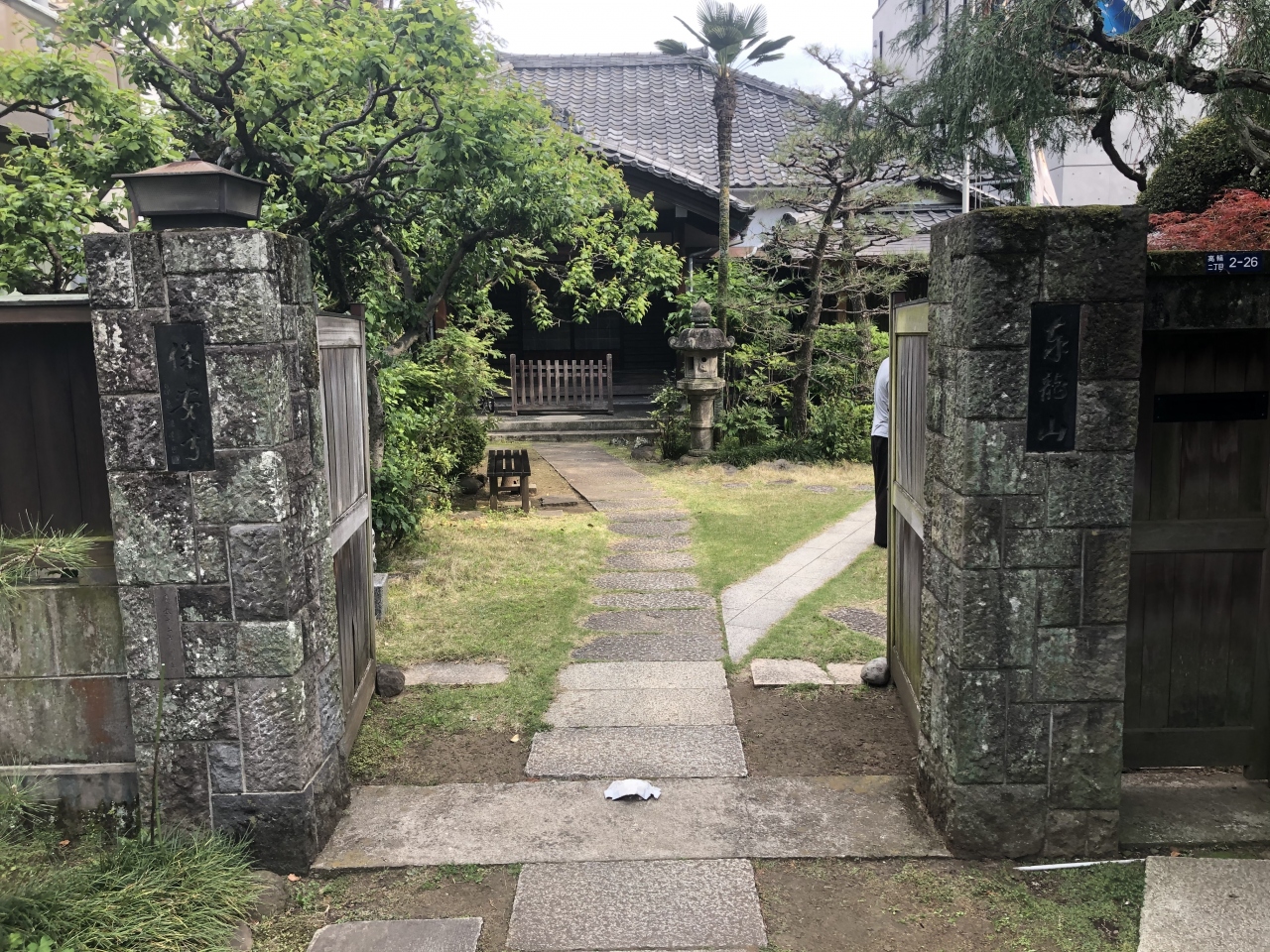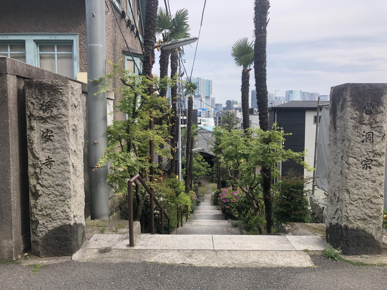 高輪周辺をジョギング中に保安寺を訪れた。最寄り駅は東京メトロ南北線白金高輪駅から徒歩10分ほど。住宅街の中に目立たない狭い入口がある。左の石碑に小さく保安寺とあり、階段を下っていくと境内に出る。