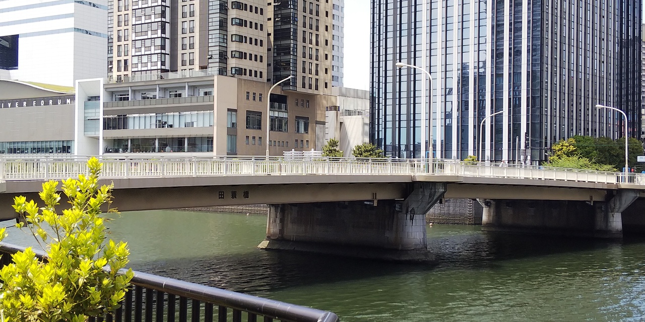 田蓑橋は中之島の堂島川にかかっている橋です。梅田よりJR環状線の福島駅のほうが近いです。オフィスビルが並ぶ中にあり、橋脚は石組の立派な橋です。車道と歩道も別れているので安全ですね。そのまま南に行くと筑前橋があります。