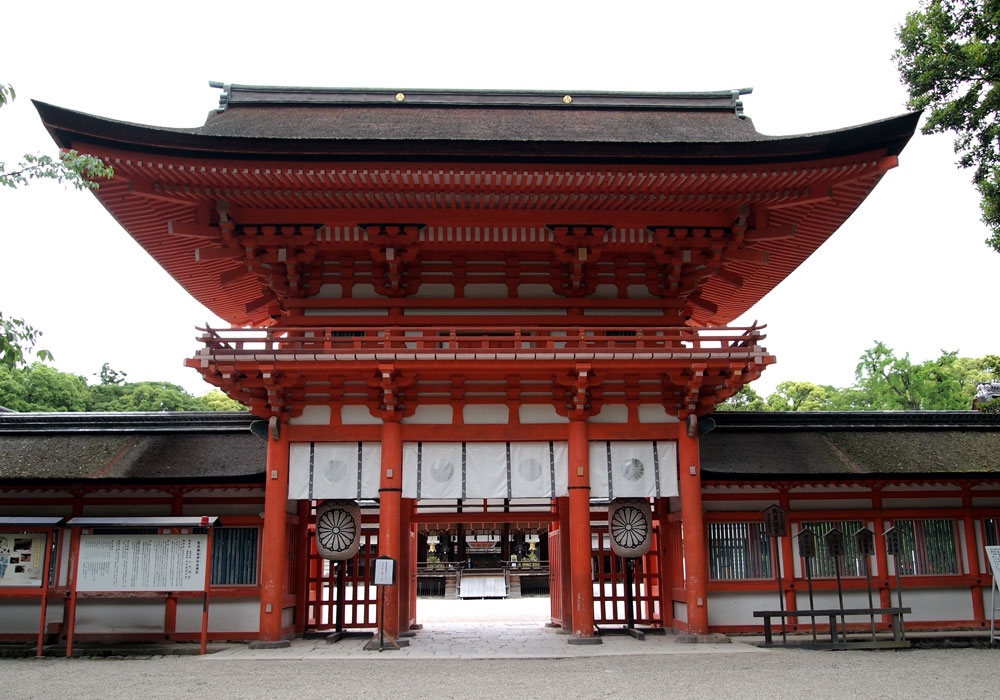 鳥居をくぐり、参道の先に高さ13メートルの立派な朱色の楼門があります。楼門の左右には回廊が延びています。この楼門は、昔は21年ごとの式年遷宮の際に、造り替えていたそうですが、1628年以降は解体修理により修復されているそうです。