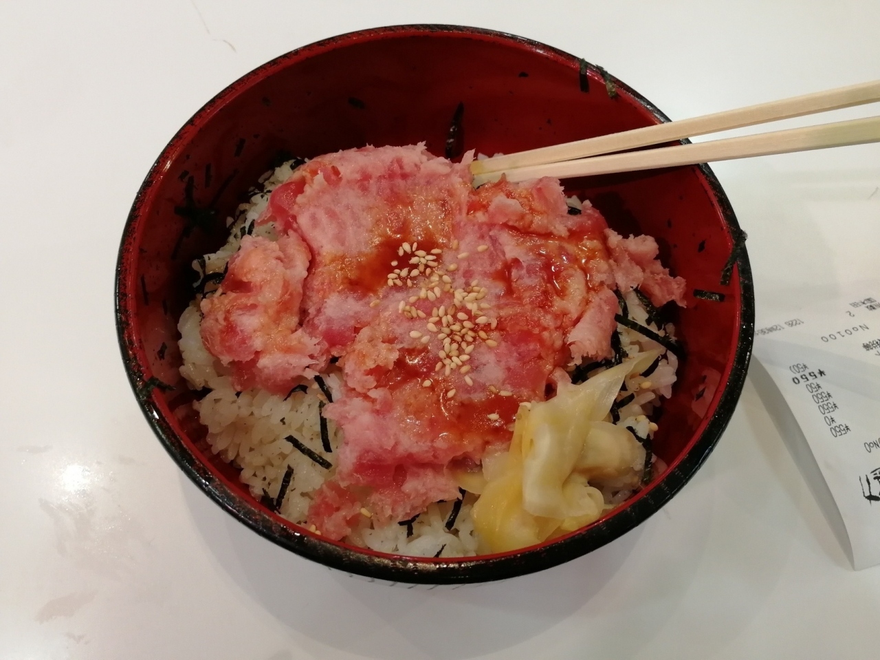 まぐろのすき身丼が550円で注文でき、+100円で味噌汁を付けることもできます。