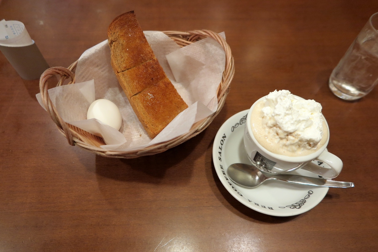 - 質の高いウインナコーヒー(500円)に黒糖を用いたトーストとゆで卵が付いたモーニングサービス、大満足でした