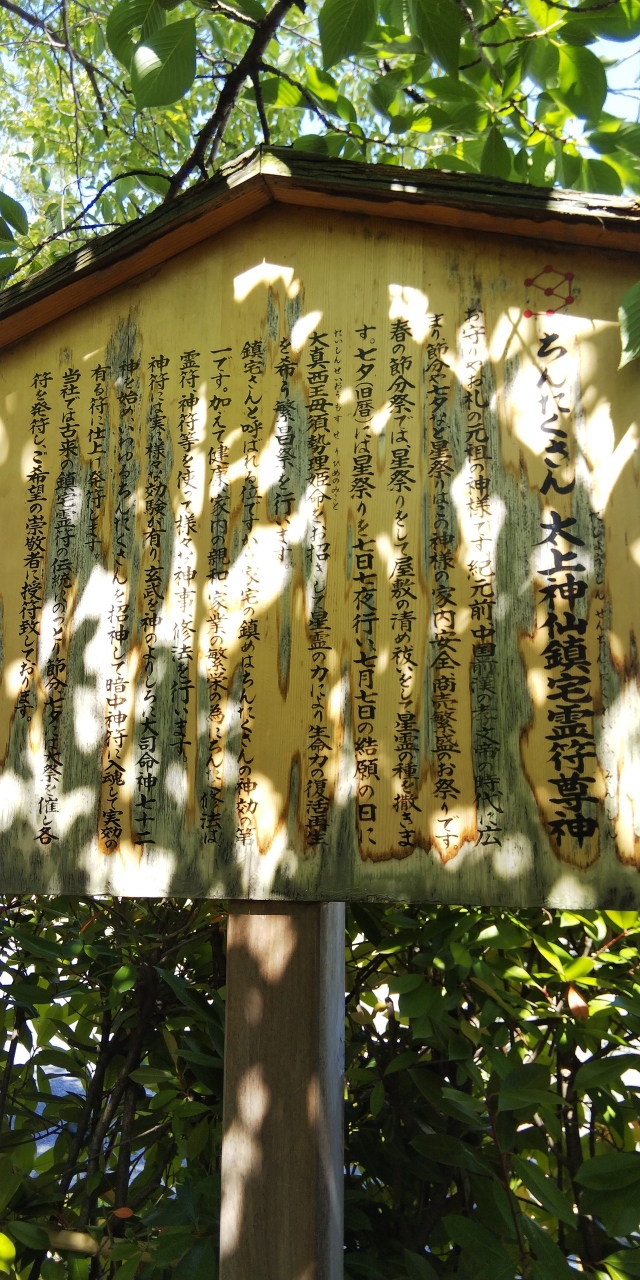 堀越神社の鳥居をくぐって、すぐ右側にある祠が太上神仙鎮宅霊符尊神です。立て看板には「ちんたくさん」と記されていました。提灯もキレイに飾られていて、手入れが行き届いているようです。お守りやお札の神様だそうです。