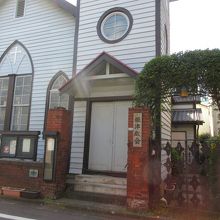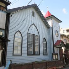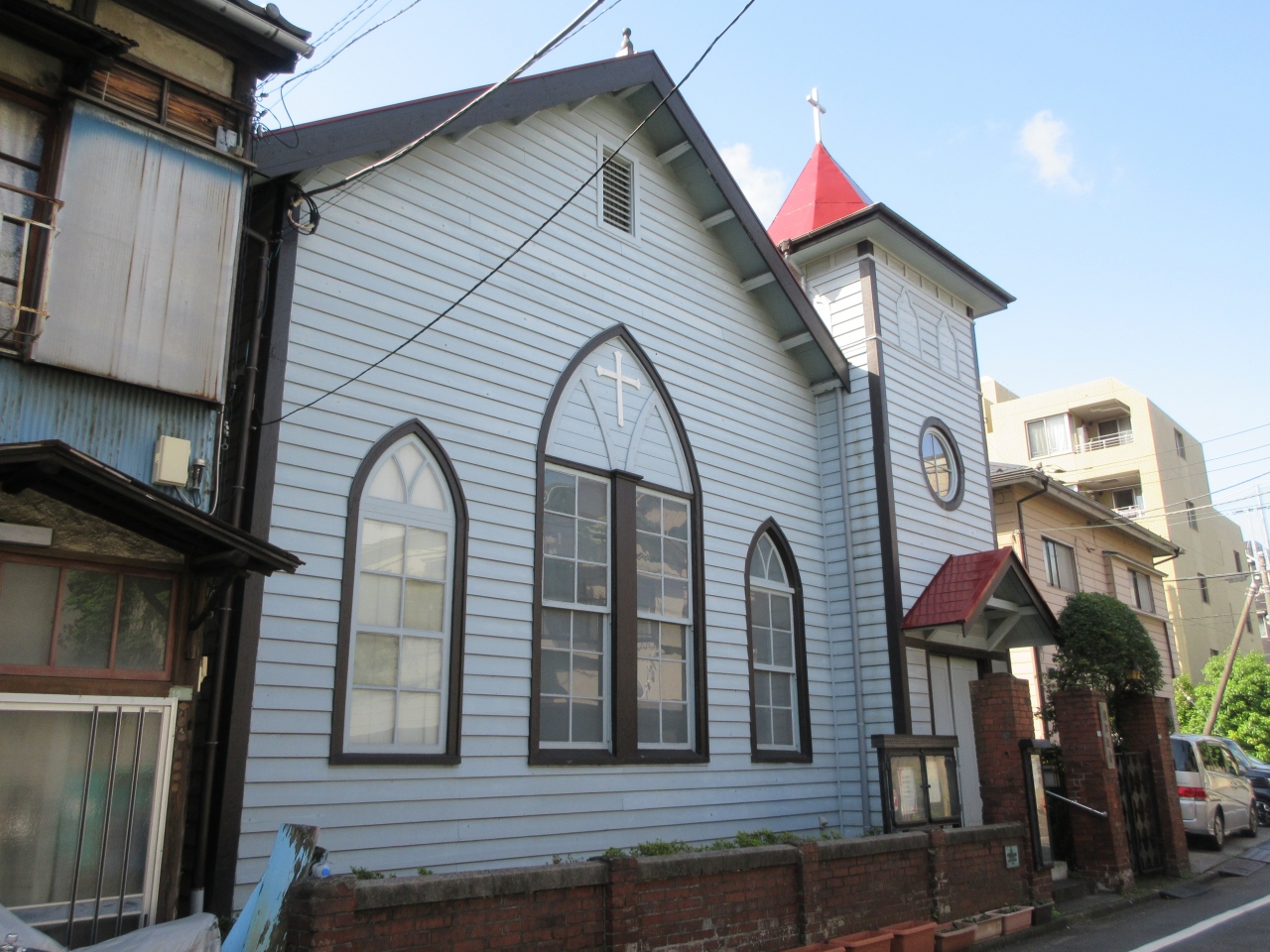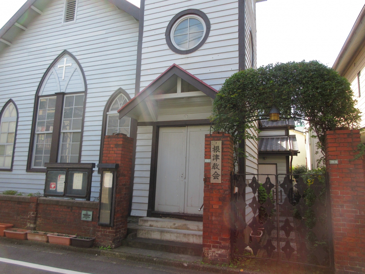 根津駅から北西へ5分ほど歩いた住宅街にあります。薄水色の壁と十字架の下の赤茶色の尖ったトタン屋根と奥の瓦屋根が懐かしい雰囲気の建物です。低いレンガ塀と牧師館の入口のレンガの門柱などが築100年の木造建築を魅力的なものにしています。すりガラスの丸窓などが街に溶け込んでいるのが特徴です。ステンドグラスを教会で見ることがありますが、木造礼拝堂にすりガラスが合っていました。根津神社の近くなので寄ってみてはいかがでしょうか。