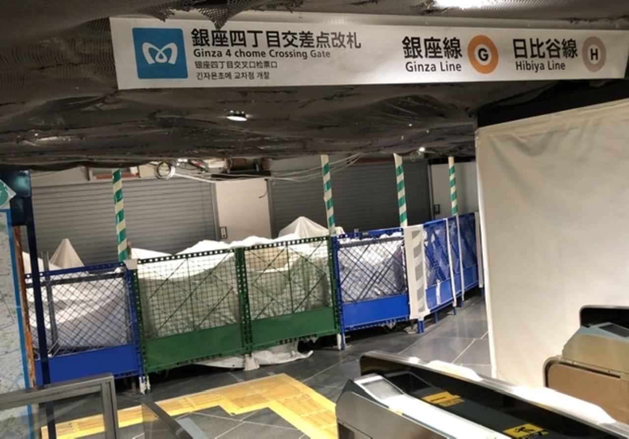新型コロナウィルスの緊急事態宣言中でしたが、この日は外せない用事あり、この界隈へやってきました。銀座駅の乗り換えをすると工事中で、柵が張り巡らされてました。銀座線の銀座駅が一番便利なところにでるのでおすすめします。