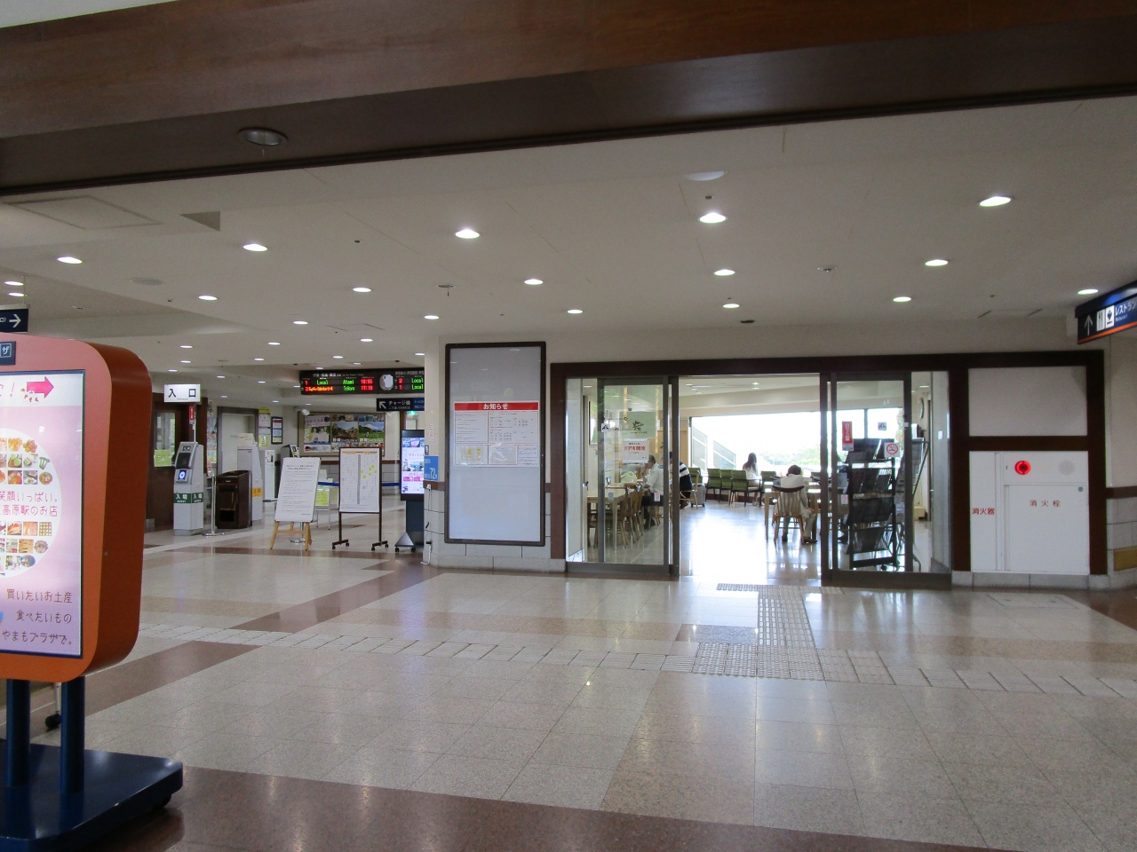 駅ビル『やまもプラザ』の完成により改札は高原口側に集約され、北側出口は高原口(桜並木口)、南側は八幡野口(やまも口)と呼ばれています。