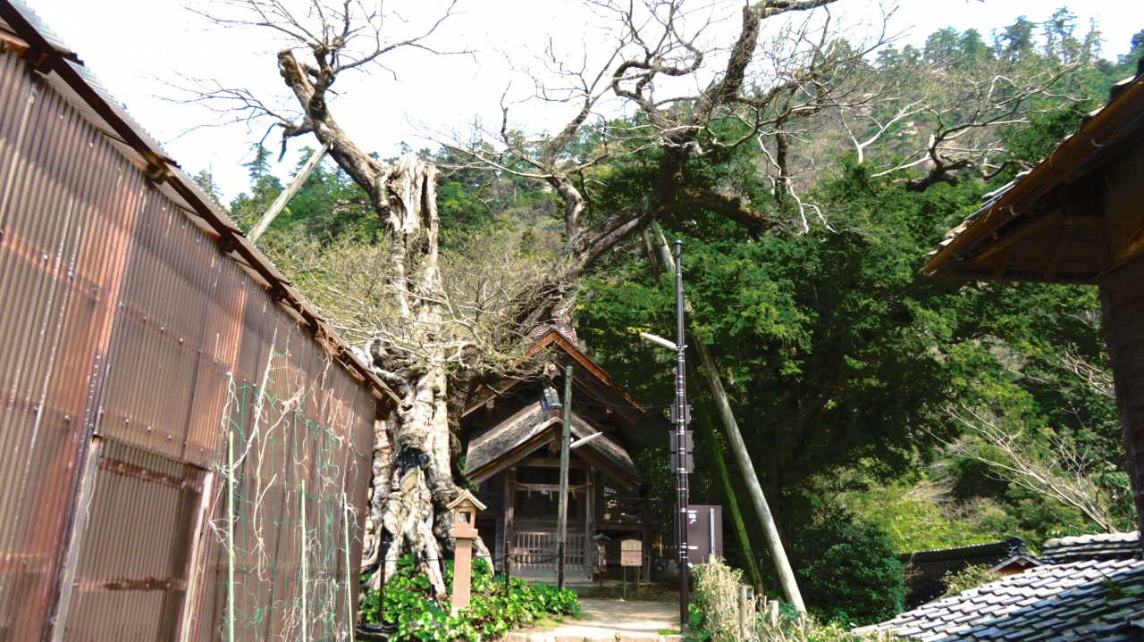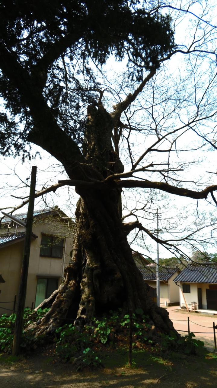 神社の敷地に入ると最初に目に飛び込んでくるのが推定樹齢1,000年といわれるムクノキです。高さ17m、根本周りが12mもあるそうです。その大きさ、存在感に小さな神社がかすんでしまいました。