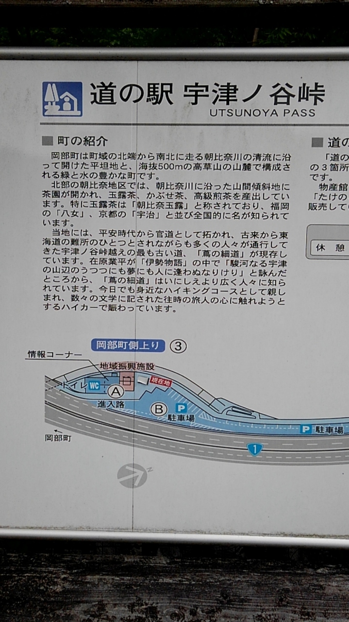 『道の駅』宇津ノ谷峠は峠を挟んで静岡市側と藤枝市側に駐車場やお手洗い、売店、休憩スペースなど3つの施設を持つ全国でも珍しい構成を持つ『道の駅』でした。私は今回、浜松方面から静岡方面へ向か途中、藤枝市側(国一上り側)を利用しました。駐車場は狭かったのですが、お手洗いはとても綺麗で感動しました。静岡市側の道の駅の方が大きいようです。