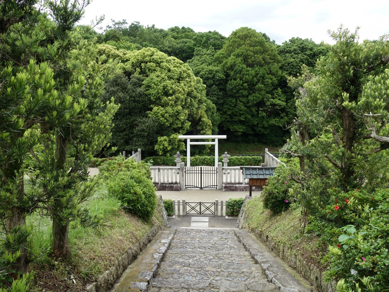 飛鳥の桧隈エリア猿石の近くに 欽明天皇陵があります。平田梅山古墳と言われる前方後円墳です。地上からではその姿はわかりません。敷地は宮内庁によって、綺麗に管理されていて、真っ白な玉砂利が敷き詰められていて、神聖さを感じさせる場所でした。陵の正面の階段を上っていくと猿石を見ることができます。