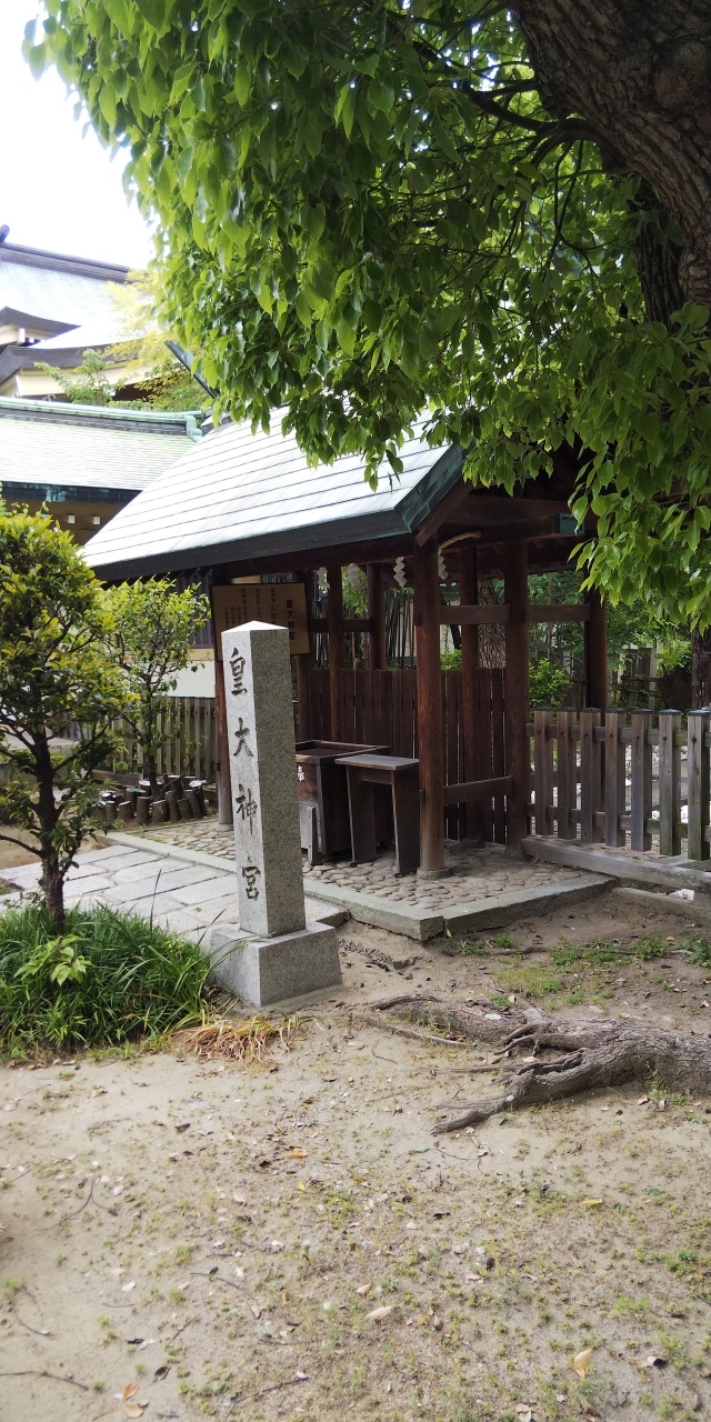 生國魂神社の敷地内にある末社のひとつです。本殿の右手奥のほうにひっそりと佇んでいます。天照大神をまつっており、大きな石鳥居も特徴的です。裏手にある池にながれる水の音がいい感じに雰囲気を出してくれています。