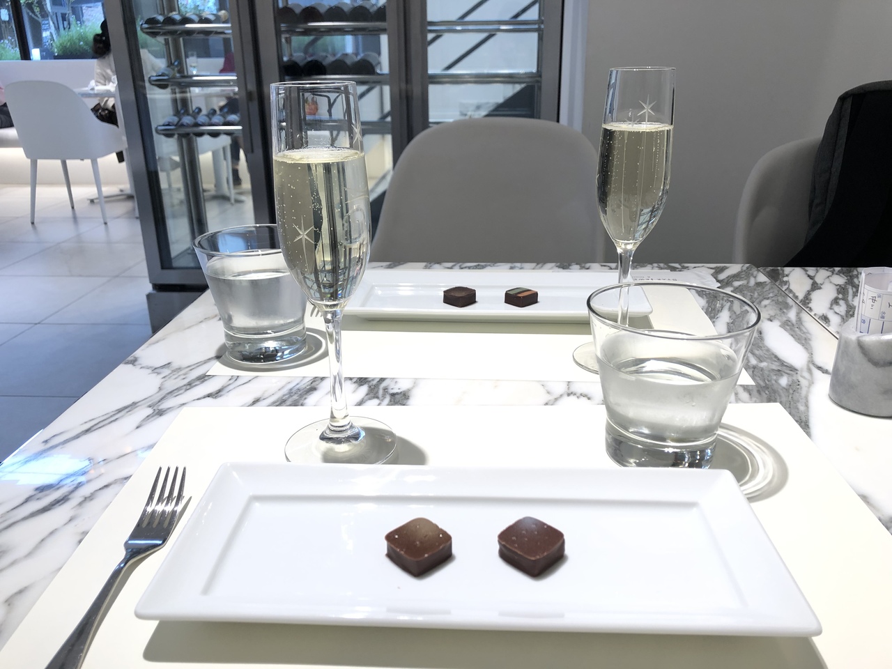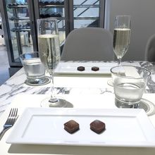 外には案内は出ていませんでしたが、休憩に入ったらちょうどスパークリングワイン+ボンボンショコラ2粒で700円というセットがあり、オーダー。スパークリングはたぶん一口かなと思ったら、ちゃんとした量が出てきて嬉しい驚き。チョコは特にキャラメルとプラリネが良かったです。