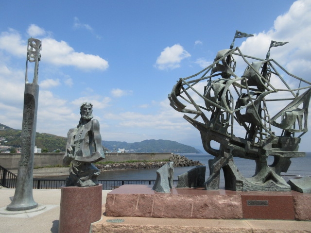 伊東の観光地、なぎさ公園の近くにある大きな銅像と石碑です。海にも松川の河口にも近い場所です。比較的大きな像で目立ちます。三浦按針と、その船をモチーフにした芸術性の高い像でステキです。このゾーンは少し広場のようになっていて、正式には按針メモリアルパークというそうですよ。