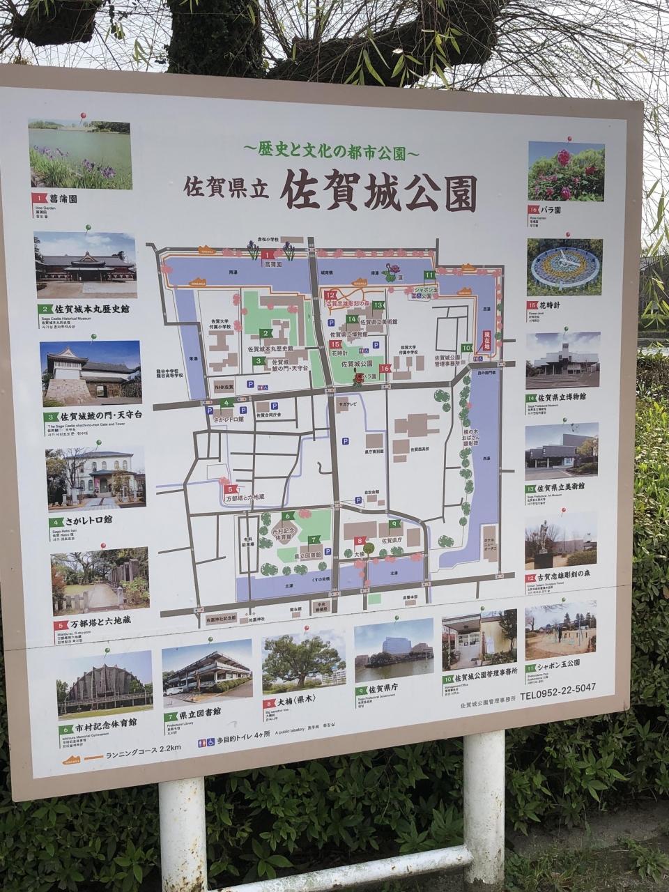 堀に囲まれた公園で、東の端から西の端まで20分くらいかけて歩きました。佐賀の有名人の銅像や佐賀城の名残りがあり、美術館や博物館、体育館、図書館、県庁、テレビ局がすぐ近くにあります。