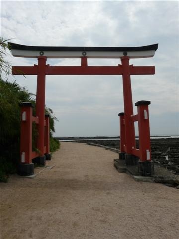 青島神社の赤い鳥居と並ぶ姿はとても奇麗。砂岩と泥岩の層が繰り返し積み重なったものが隆起して水面上に現れ、