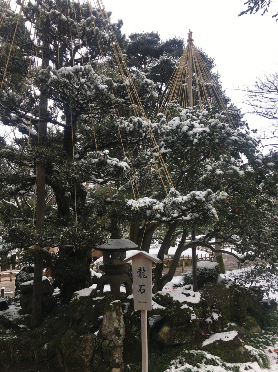 石川県立伝統産業工芸館の近くにあります。龍石の後ろに咲いている椿のことを、龍石の椿といい、椿の品種名にもなっています。ちょうど見頃の時期に行けました。ピンクの可愛らしい椿の花が、雪が積もるなか力強く咲いていました。