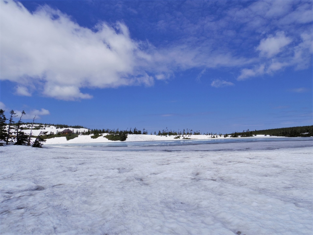 現在 沼の雪解けが とてもきれいです。 全体的に 雪解け水が広がって 薄い青色になっていました。八幡馬周辺の散策道は ほとんどが深い雪に埋もれていて、 木道が見えているところは ごくごく一部です。 踏み抜きにも注意が必要です。