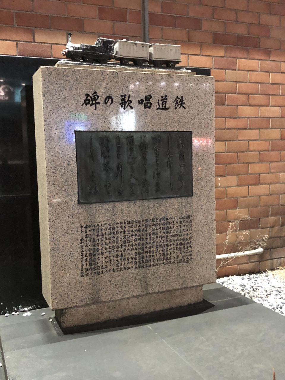 新橋駅の汐留側にあります。石碑の上にはかわいらしい鉄道がデザインされていて、今にも走り出しそうなほどリアルです。もとはちびっこたちの地理の学習のために作られた歌ですが、鉄道愛好家にも親しまれています。