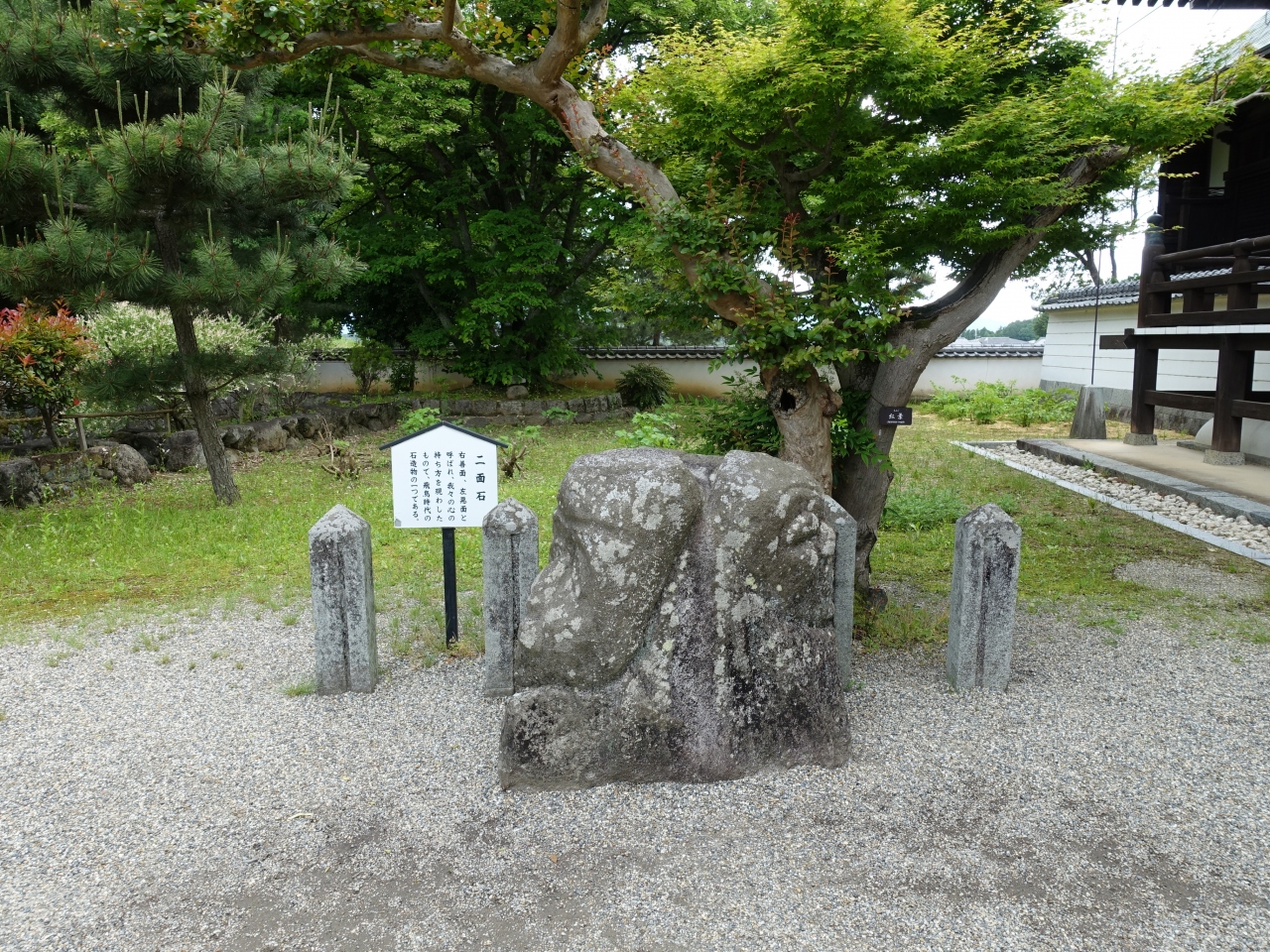 聖徳太子が誕生したといわれている橘寺。その境内に、二面石という案内板が建てられていて、時代を感じさせる石が置かれています。高さは1メートルほどの花崗岩の両端に顔が彫られています。どちらが表ということはなく、善の顔と悪の顔。悲しいかな、人間の変わらない姿なのかもしれません。