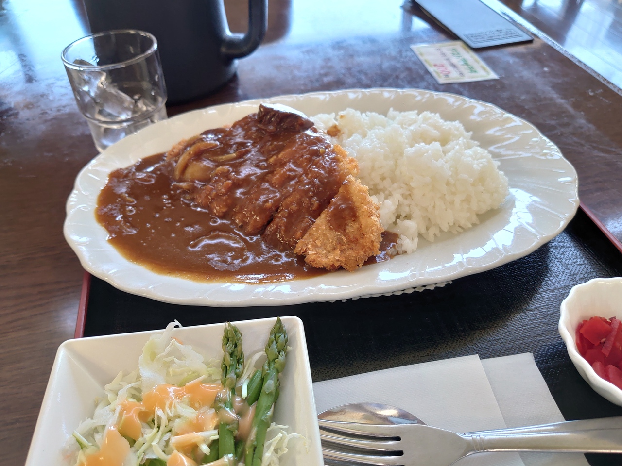 こちらの道の駅には温泉だけではなく併設している喫茶店もあり夜8時半ぐらいまで営業しています。季節によってはその月限定のメニューが提供されていることもあります。今回はカツカレーを注文して食べてみました。カレーはちょっと辛いかなという感じで、メインの数はそんなに厚くはなかったけどサクサクとした食感で無論美味しかったです。アスパラとキャベツのドレッシングのかかったサラダも出てきますが、アスパラが嫌いということもあり残してしまった(._.)