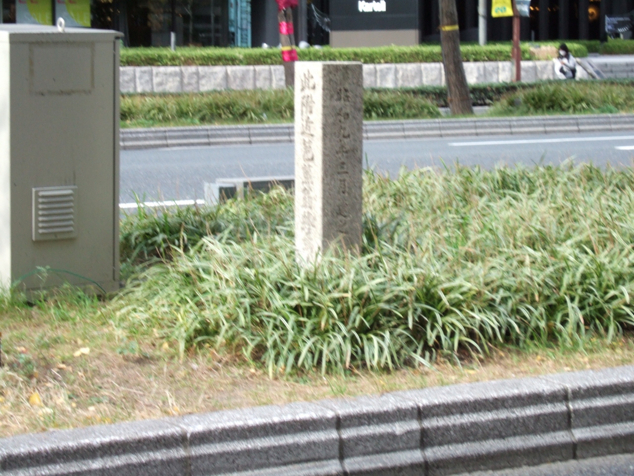 心斎橋から本町まで歩く際に地図を見ると、「松尾芭蕉終焉の地」と書いてあったので見ておこうと思いましたが、気づいた時には船場の高速道路。おかしいな・・・と思いながら歩いて戻ると、なんと、側道との分離帯に石碑がありました。遠くからで表の碑文しか読めませんでしたが、確かに「此附近芭蕉翁・・・」と書いていました。