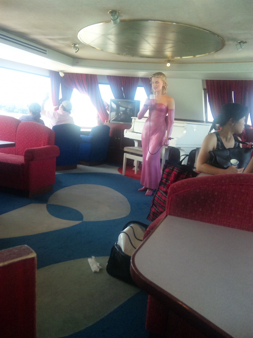 鳥羽湾めぐりの船は派手な竜宮城をイメージした船と外観が少し落ち着いた感じのフラワーマーメイド号があります、自分はフラワーマーメイド号に乗りました、船内はやはり派手です、人形姫や、船頭の外人ぽい女性、でも気分はウキウキ