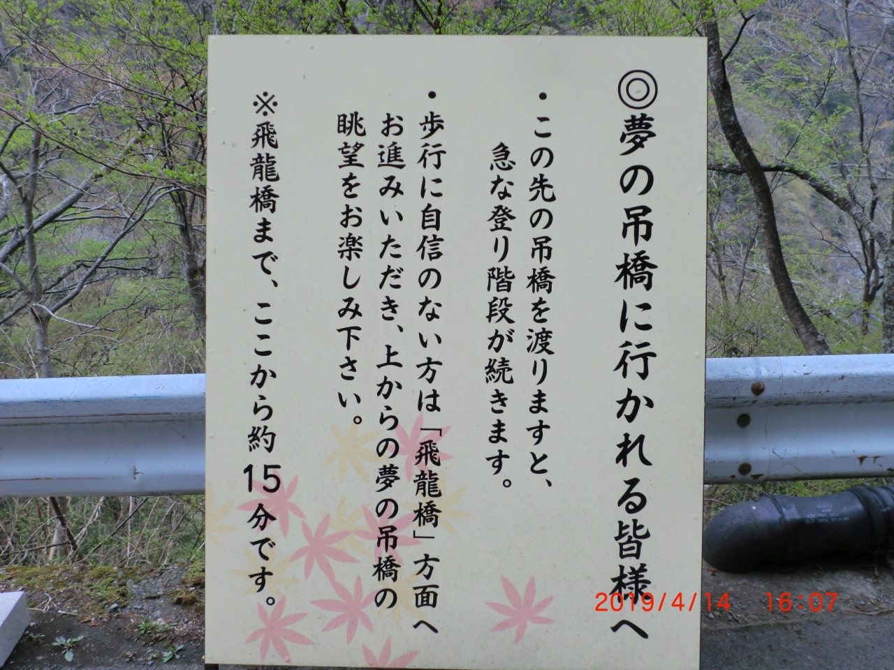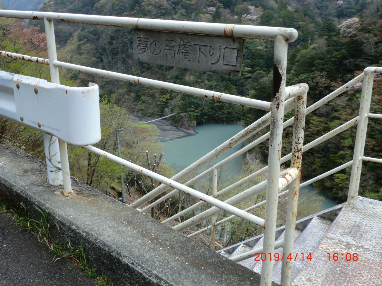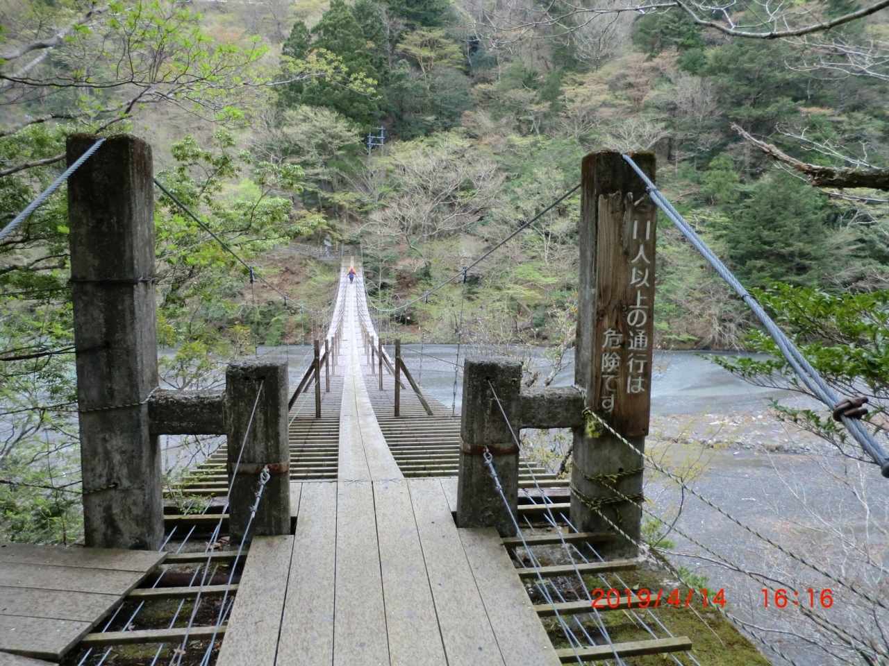 旅館に到着して受付をしていたら往復1時間と言われ、荷物を置いて15:45出発、登り坂を25分歩き、吊り橋の見える所まで。ここから下り階段で30分強で吊り橋へ、揺れる吊り橋を往復しました。橋の下流側はエメラルドグリーン、上流は砂利。もう少し水の量が多い時に行ったほうが良かったかなあ。??