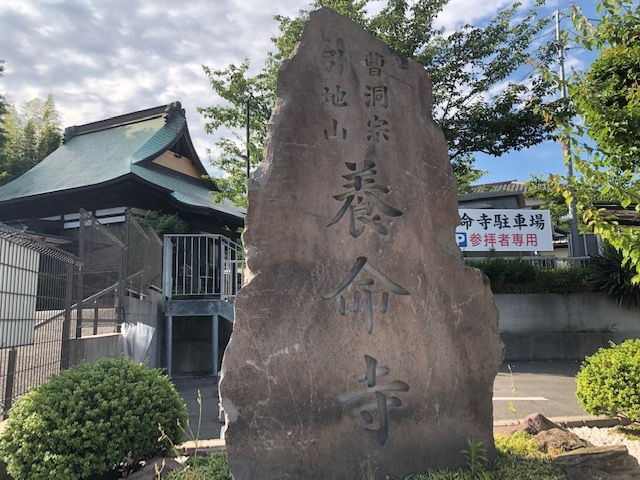 引地川に架かる引地橋の西、県道43号線(旧東海道)沿いに養命寺はあります。メルシャンワインで有名なメルシャン・藤沢工場の隣です。大通りに面した寺院の入口には、「曹洞宗引地山 養命寺」と刻まれた大きな石が建っていおり、参拝者用の駐車スペースが本堂前に多数あります。