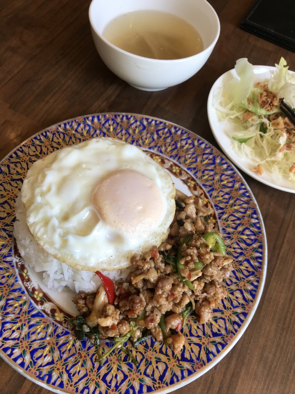 グリーンカレー、パッタイ、カオマンガイなどの王道メニューがランチでワンコインで食べられます。スープとサラダは自分で取ります。メインも程よいボリュームで、本格的なタイ料理がこのお値段で食べられるので重宝しています。
