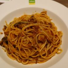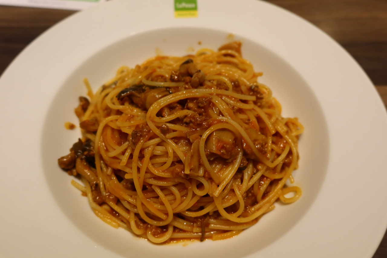 頂いたのは、きのこのミートソースパスタ(ドリンクバー付き)。茹で上げパスタというだけあり、熱々なのは良いのですが、味はたんぱくであまり美味しいとは思えませんでした。