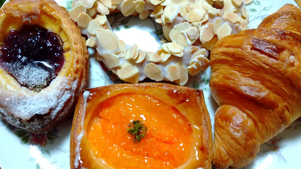 クロワッサン、デニッシュ2種、バケットを買いました。