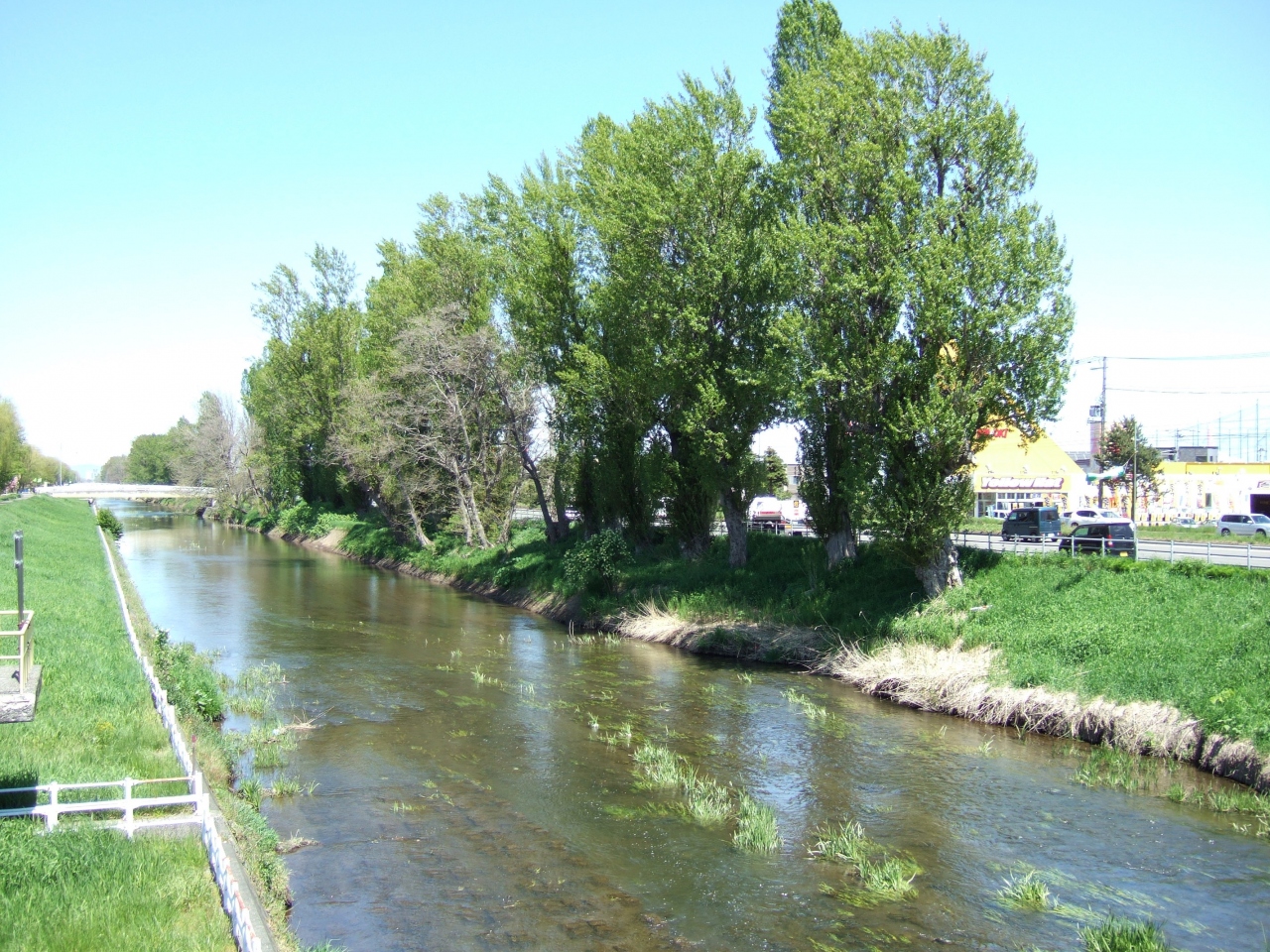 札幌市内から石狩街道を創成川沿いに北へ進み、住所が北〇条でなくなったあたりからポプラ並木が続いています。道路は車の通行量が多いですが、歩道は歩く人も少なく、創成川の水も意外と澄んでいて、晴れた日に歩いていると気持ちが良いです。