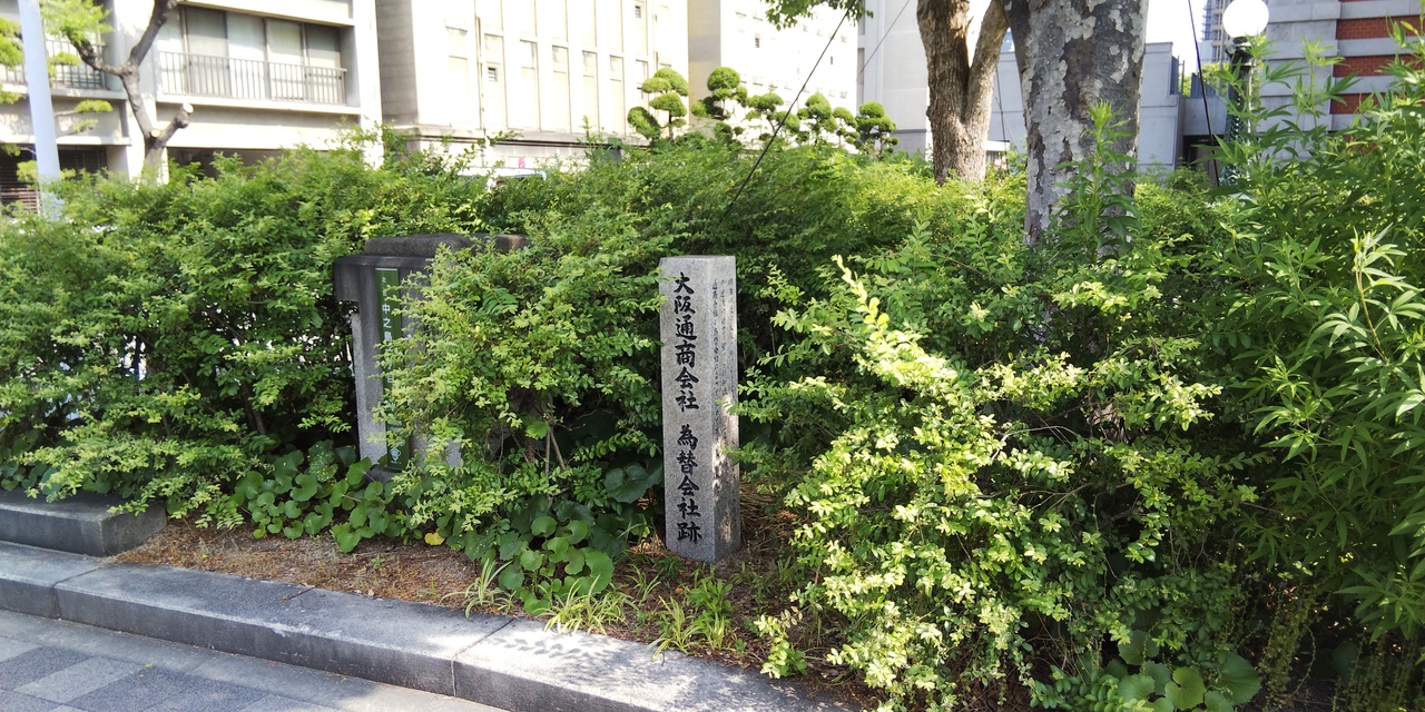 大阪通商会社 為替会社跡は梅田に近い中之島の中央公会堂のそばにあります。栴檀木橋のすぐ北側あたりです。明治2年に設立された2つの会社の跡地ですが、現在は石碑が残っているだけです。2つの会社とも5年程度の短命でしたが、お金の貸付などをおこなったりして、関西経済の発展に寄与しました。