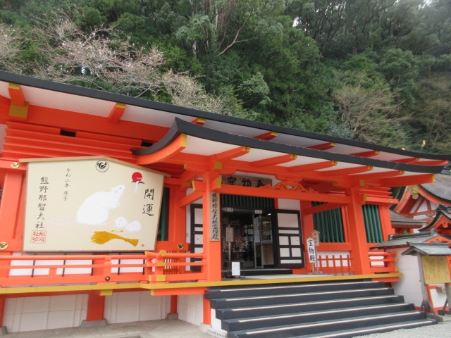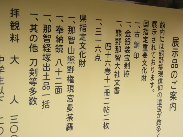 熊野詣で、那智大社に行きました。その大社の境内にある宝物殿で、わかりやすい場所です。赤い柱に白い壁の建物で、中は地味目ですし、そんなに広くはないのでちょっとした時間で見学できます。曼荼羅や刀などとともに、いくつかの資料が並んでいました。
