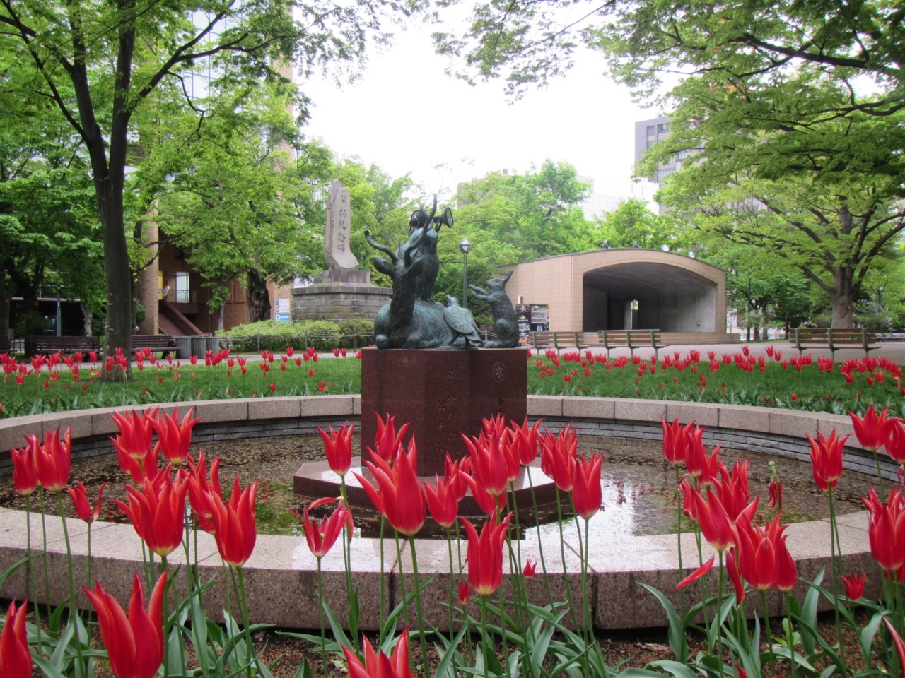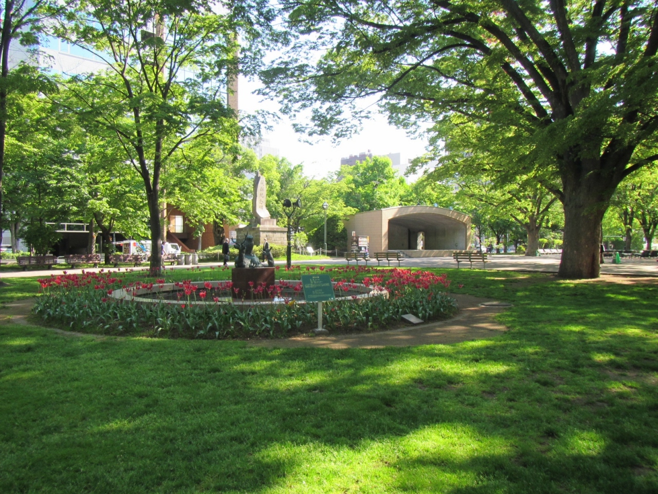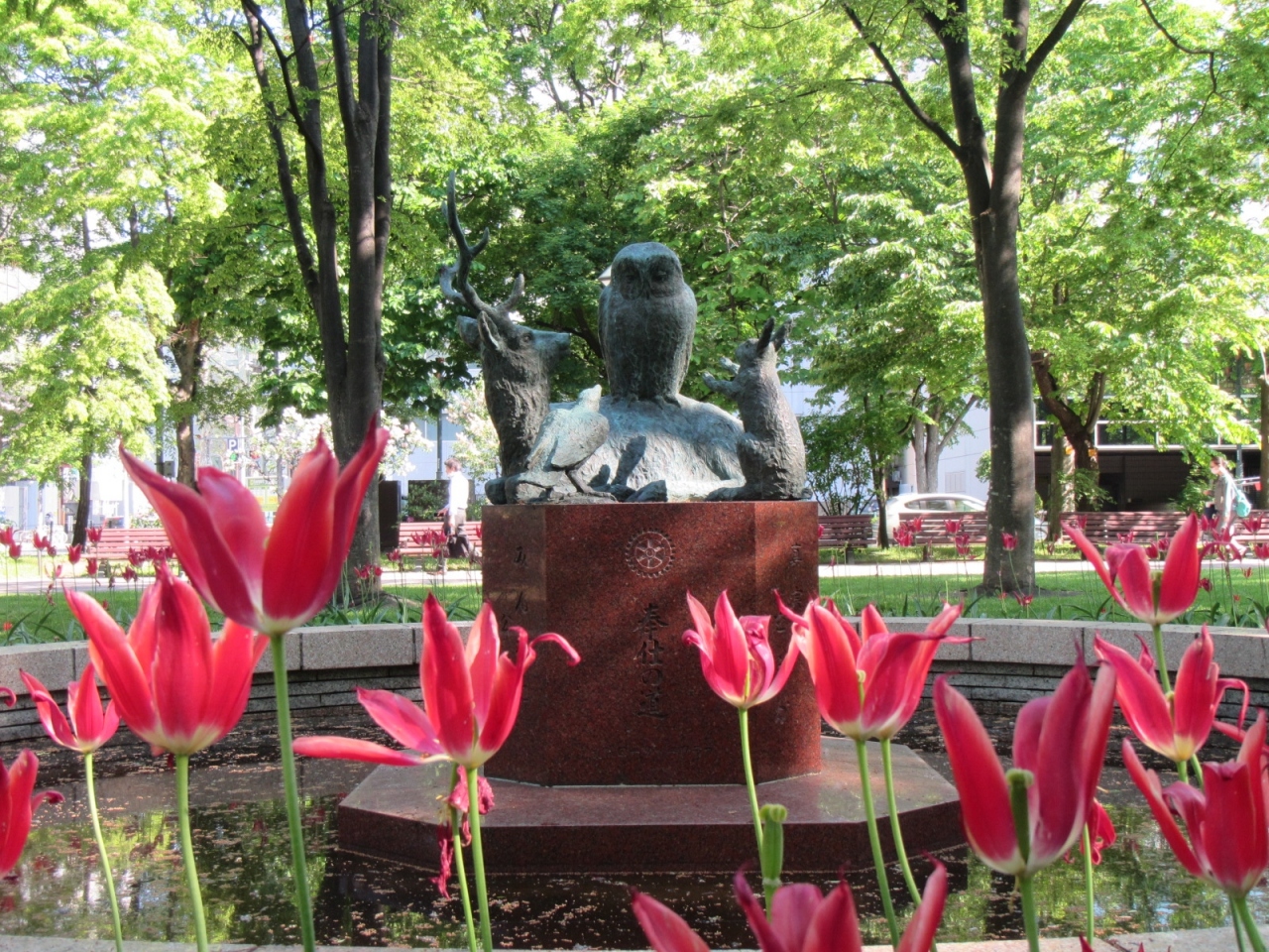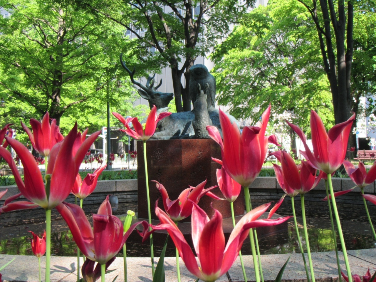 大通公園には各所に花壇に草花が植わり、景色に調和した美しい彫刻があります。