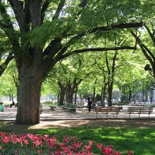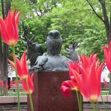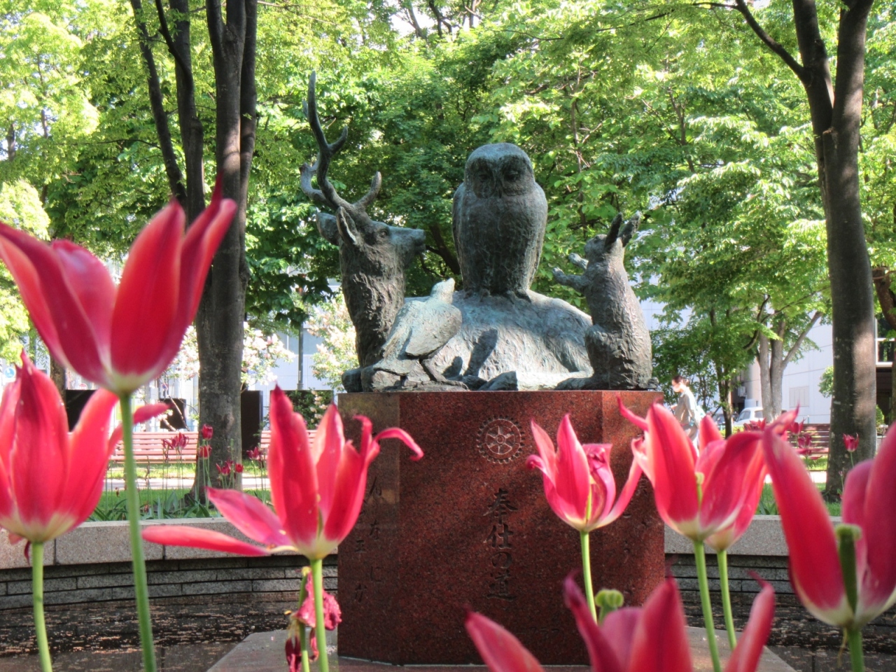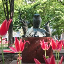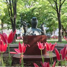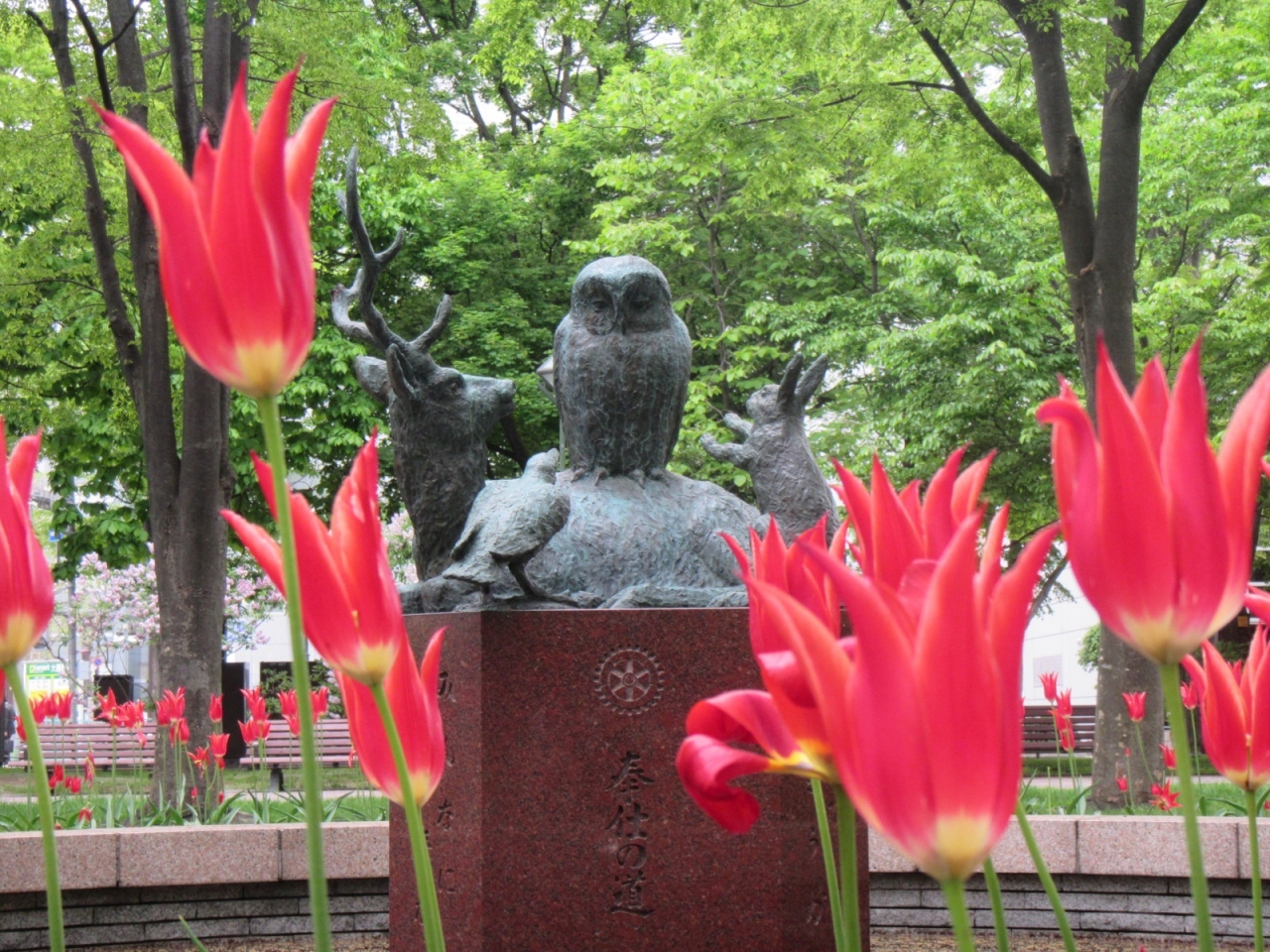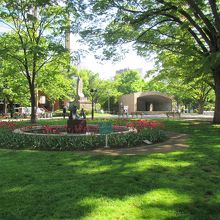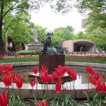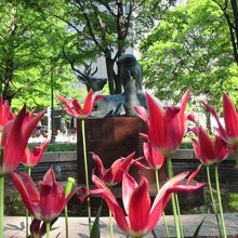 5月中下旬辺りに訪れると、彫刻の周りにチューリップが咲いてきれいです。