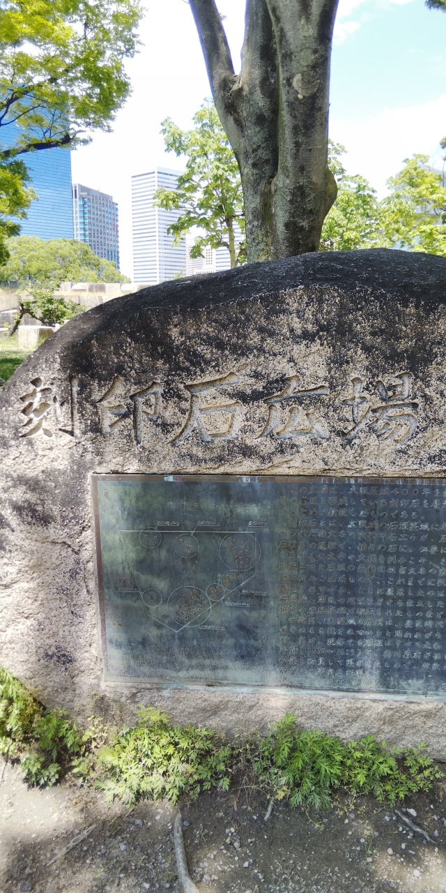 大阪城の石切場の刻印は本丸の北側の山里丸にあります。大きな石に刻印石広場と刻まれており、説明文も掲載されています。