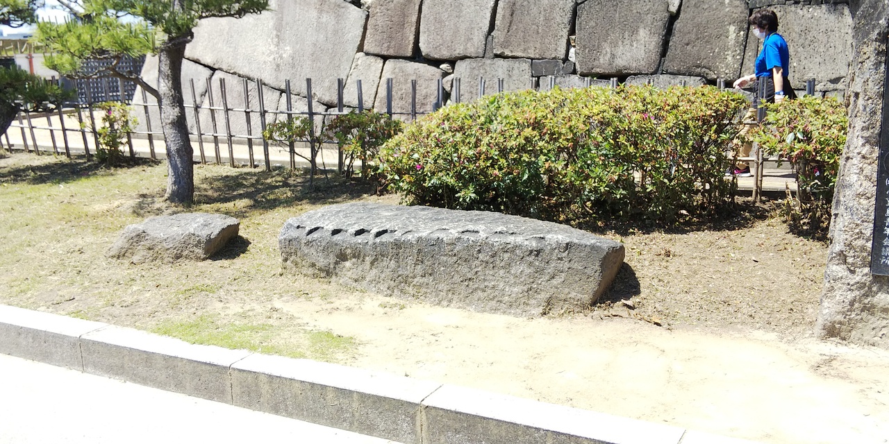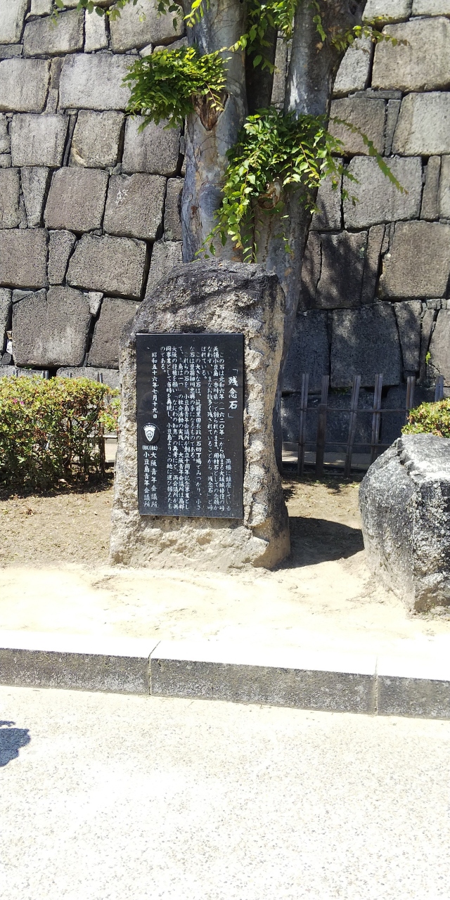 残念石は大阪各地で見かけます。大阪城の石垣用に選ばれ、運ばれたものの、使用されなかった石達です。本丸の天守閣前にある残念石は、1620年からの大阪城修復のために小豆島から取り寄せたものです。なかなか大きな石が設置されています。
