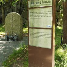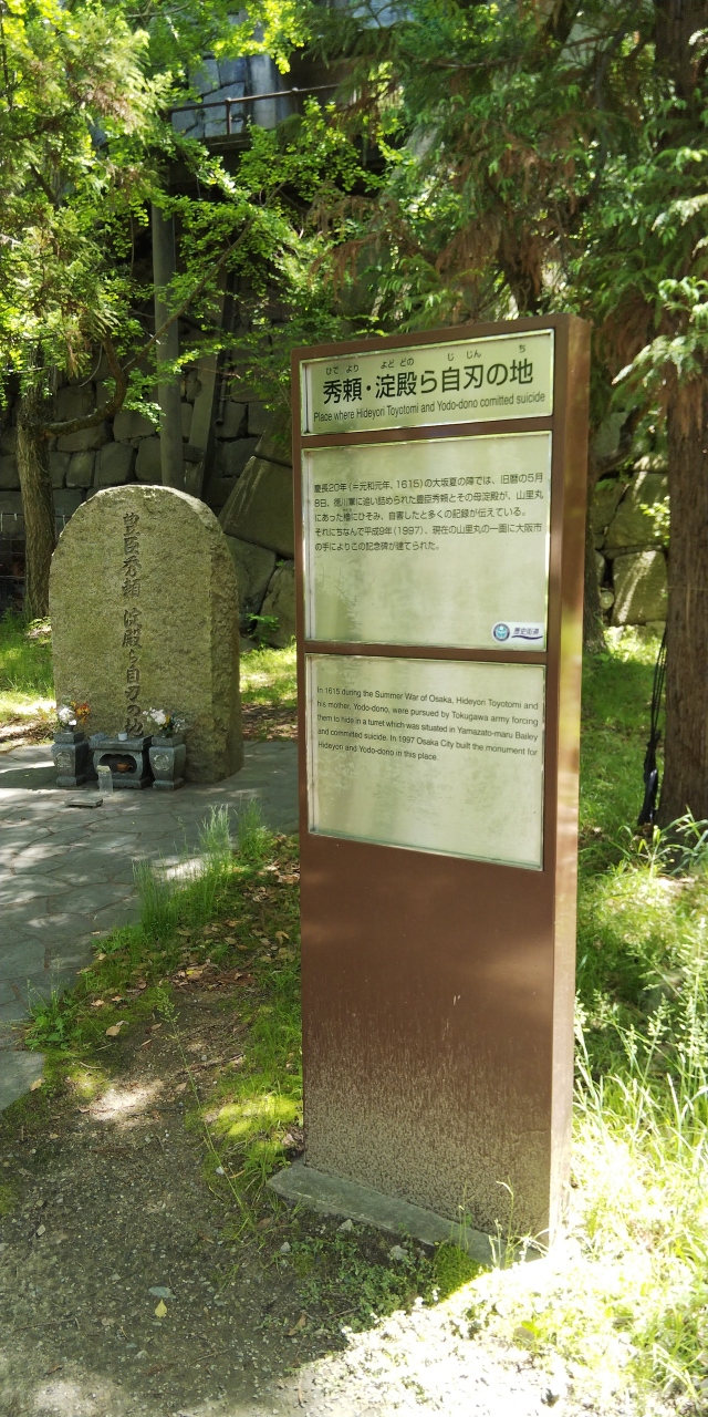 大阪城の天守閣のある本丸の北側、山里丸にあります。1615年大阪城が落城した際に、豊臣秀頼と母・淀殿、家臣30名が自刃した地の悲しい石碑です。ピンポイントにこの石碑がある場所ということではなく、山里丸内の櫓内だったそうです。石碑自体は1997年に造られたもので、比較的新しいものです。